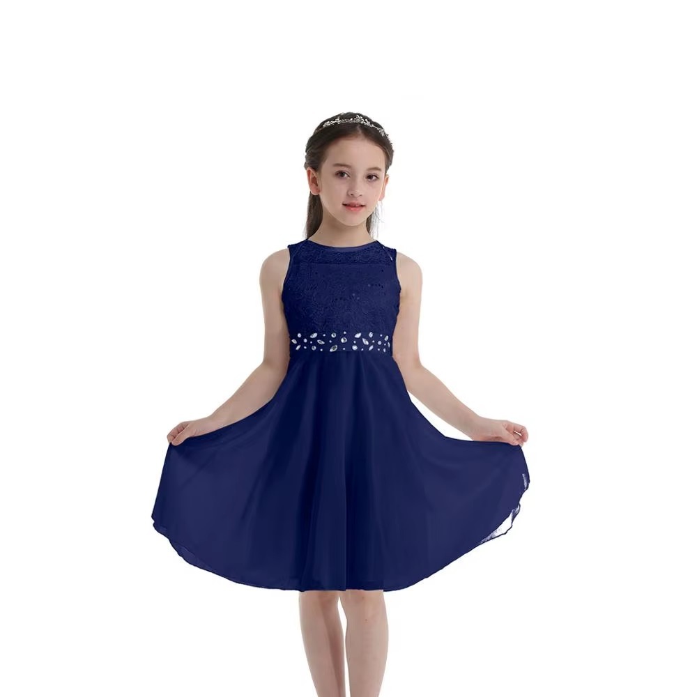 Vakker kjole til jente. Medium lengde. Detaljer med paljetter og blonder på overdel og belte i midje. Lett skjørt med vidde. Passer til anledninger som... Les mer