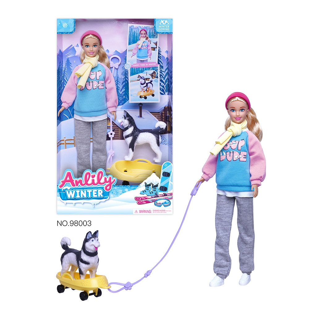Anlily vinterdukke med vinterklær, pulk og hund. Bli med Anlily ut på snøeventyr!