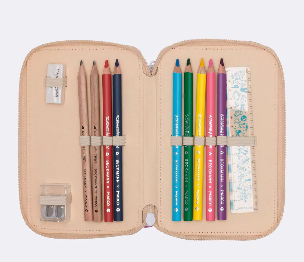 Pennalet er fullt av overraskelser, og inneholder selvfølgelig alt du trenger til skolen og leksene. Blyanter og fargestifter laget av FSC-sertifisert tre.