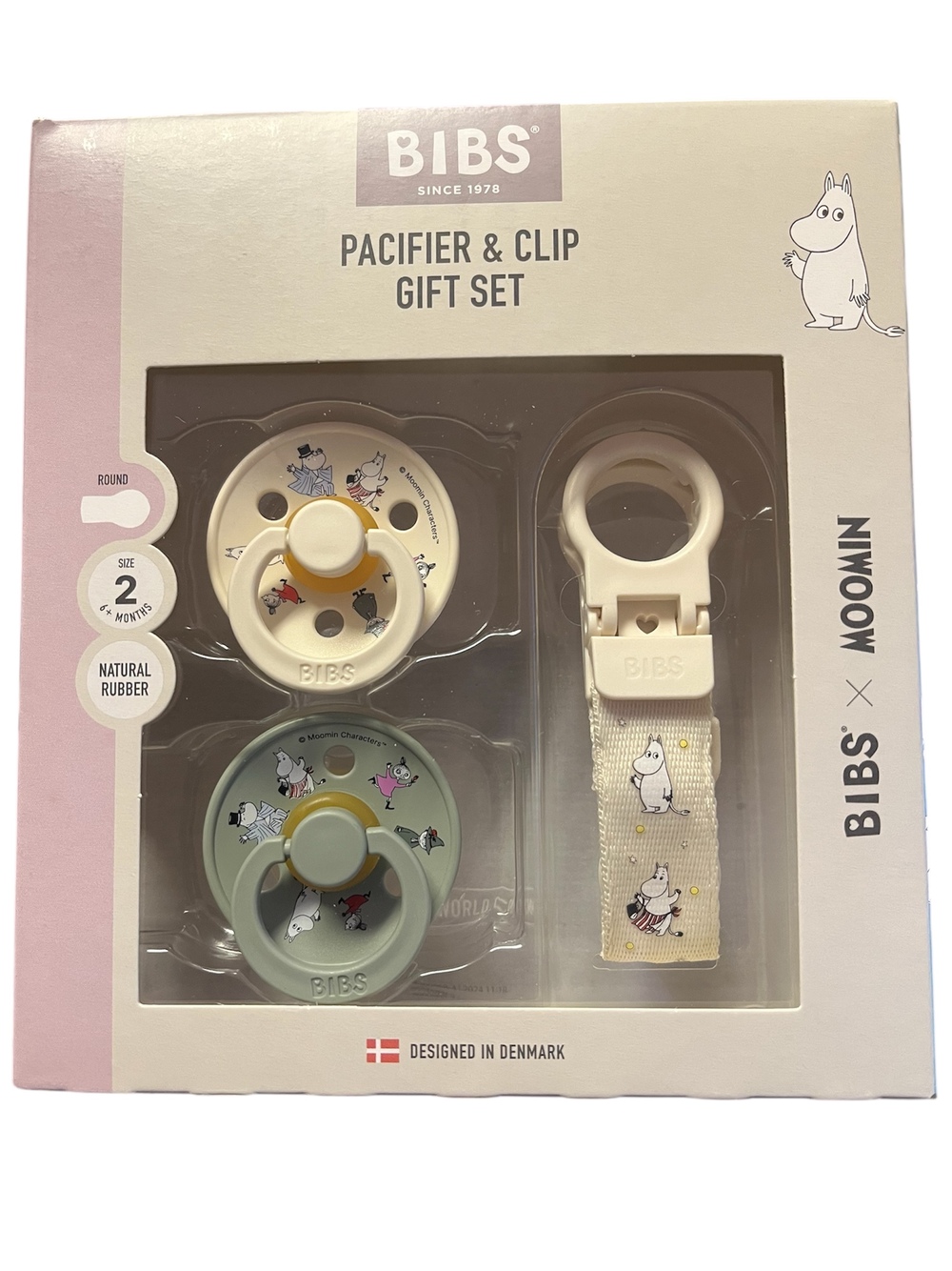 BIBS MOOMIN COLOUR PACIFIER & LOOP CLIP GIFT SET - SIZE 2( 6 MND+) NATURAL RUBBER