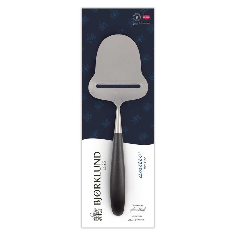 Amitto er den nyeste serien ostehøvel og kniver fra Bjørklund1925. Navnet Amitto er hentet fra latin og kan oversettes med å avvise, løsne eller gi slipp på. Når ost blir romtemperert kan den lett klebe til ostehøvelen. For å redusere dette problemet har vi utviklet Amitto. Med en mekanisk behandling av stålet får vi en klebefri overflate. Samtidig gir det en ostehøvel som skjærer bedre og har en overflate som holder seg pen lengre.