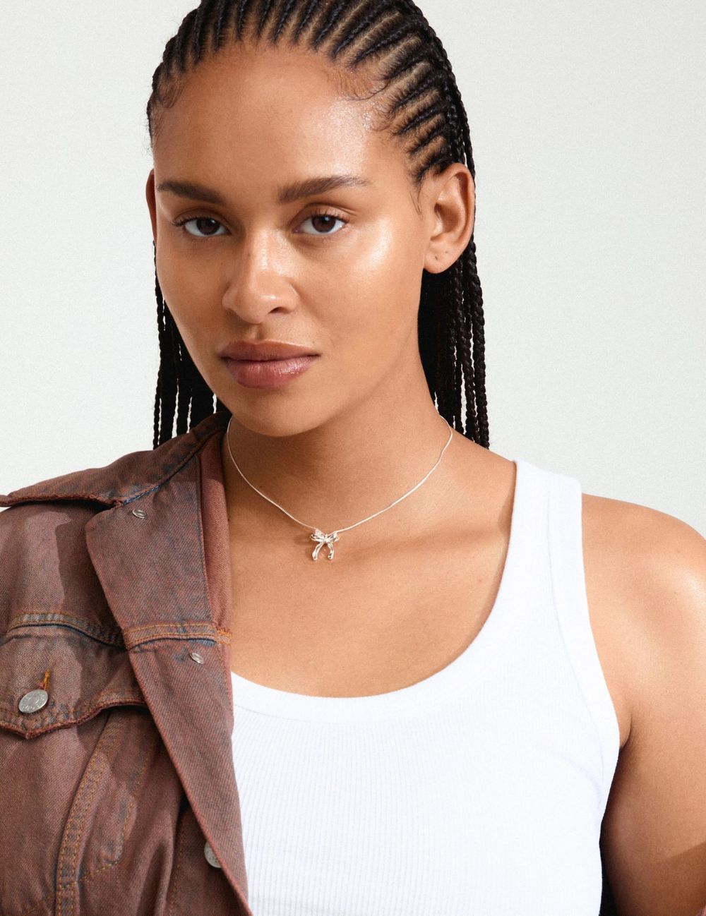 Nydelig sølvbelagt halskjede med trendy sløyfeanheng