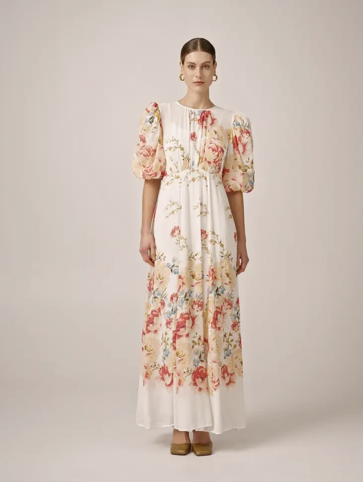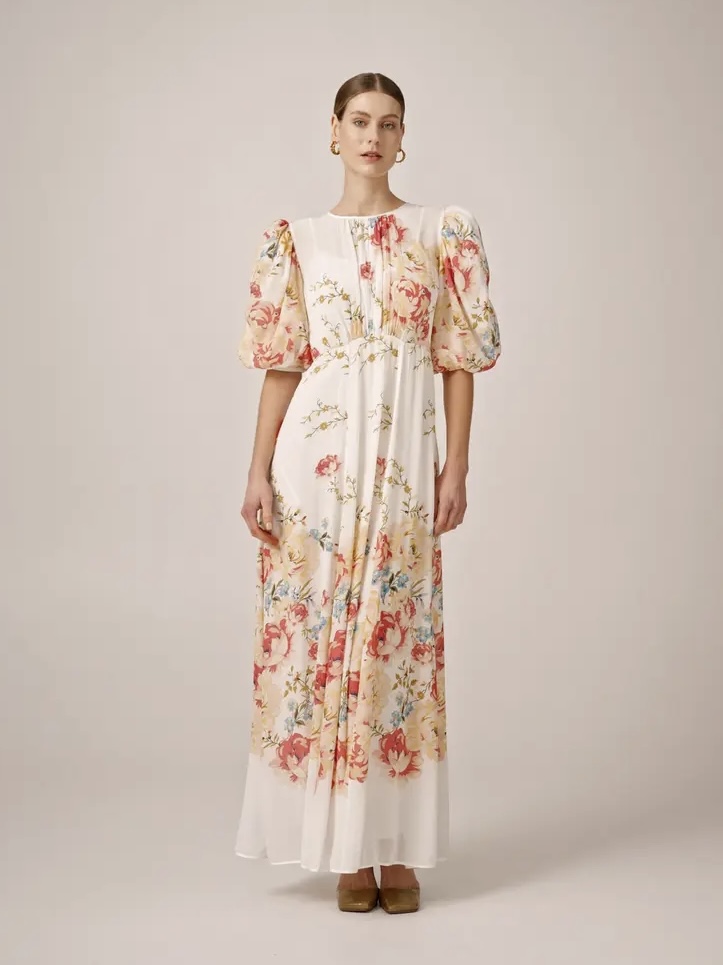 Vakker kjole fra byTiMo med hvit bunn og blomsterprint i fine farger. Chiffon maxi kjolen har rund hals og åpning med knapp bak i ryggen. Den har søte korte puffermer og liten åpning foran i halsen. Glidelås på den ene siden. En vakker kjole perfekt til et sommerbryllup.