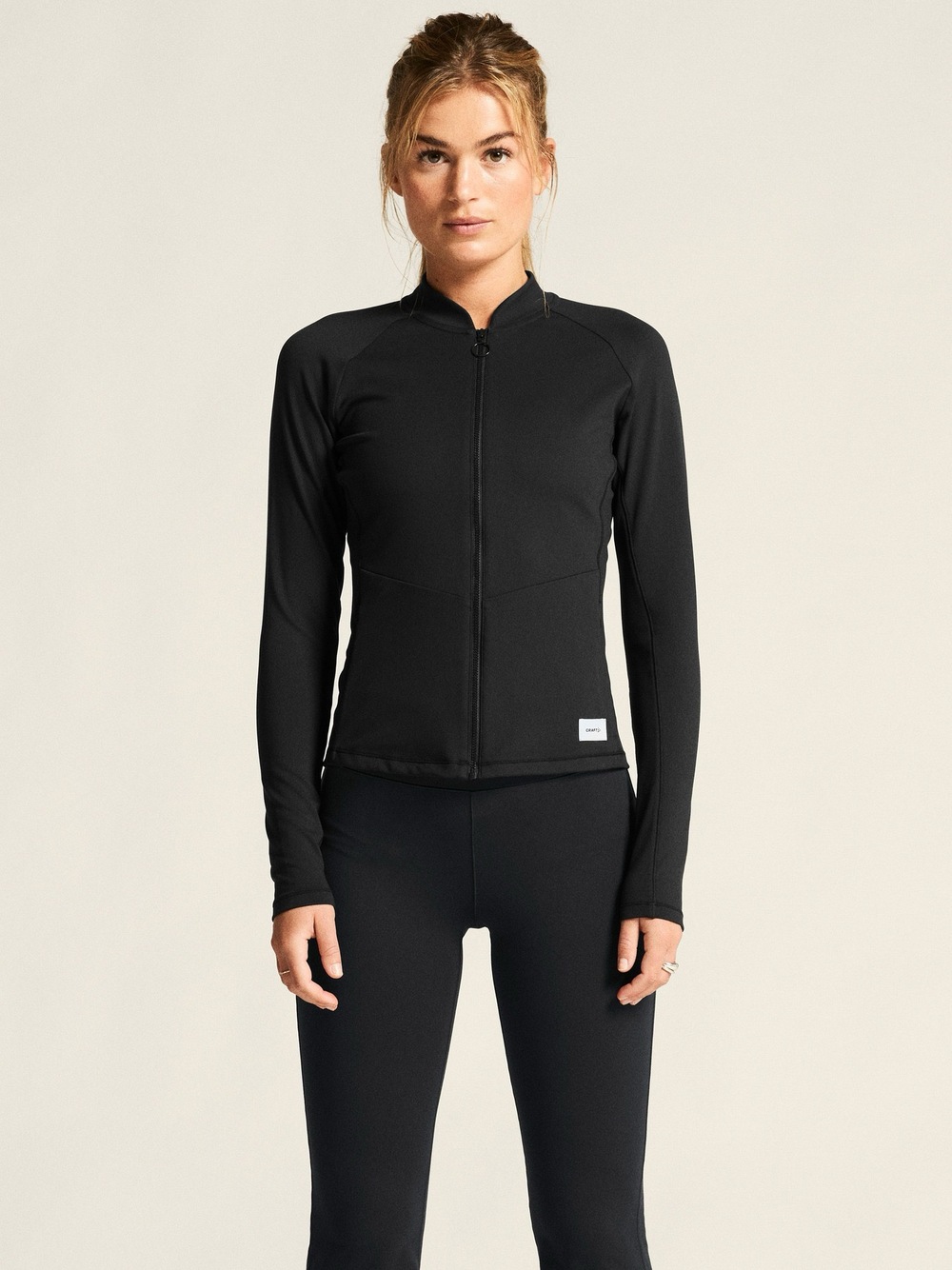 Denne allsidige genseren er laget av myk, elastisk polyester med ferskenutseende finish, og gir utmerket bevegelsesfrihet og en glatt og behagelig følelse mot huden. Den har en krage i bomber-stil og kan enkelt legges under en varmere jakke, noe som gjør den ideell for både innendørs og utendørs bruk.