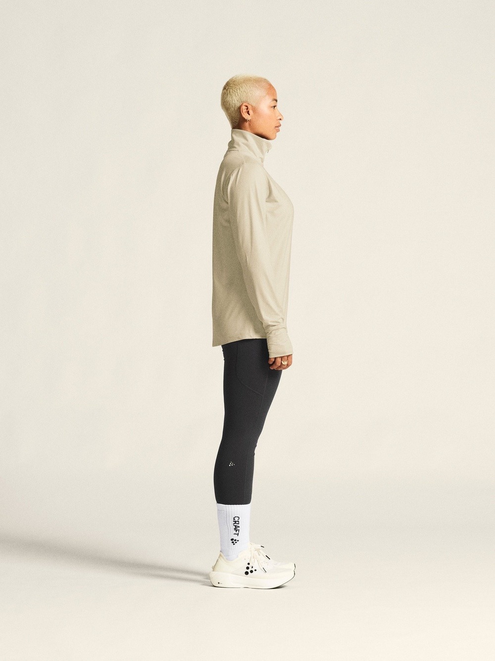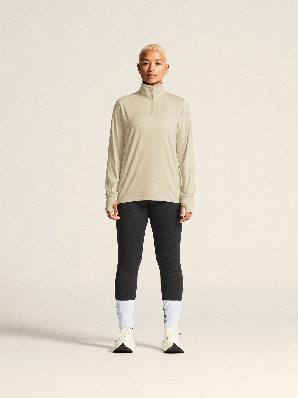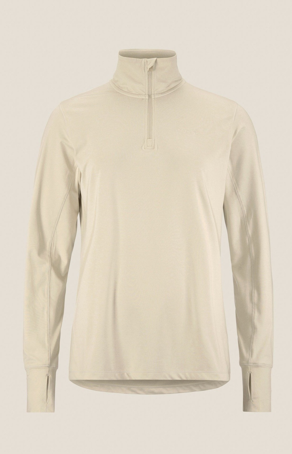 Denne multifunksjonelle jerseyen med halv glidelås er laget av en funksjonell blanding av resirkulert polyester og elastan, med en subtilt ferskenutseende overflate som gir en myk følelse. Den langermede trøyen har også en litt mer avslappet passform enn tradisjonelle, tettsittende basislag, noe som gir bedre allsidighet og tilpasningsevne. Bruk den alene eller under en jakke eller mellomlagstrøye for ekstra isolasjon under kaldere forhold.