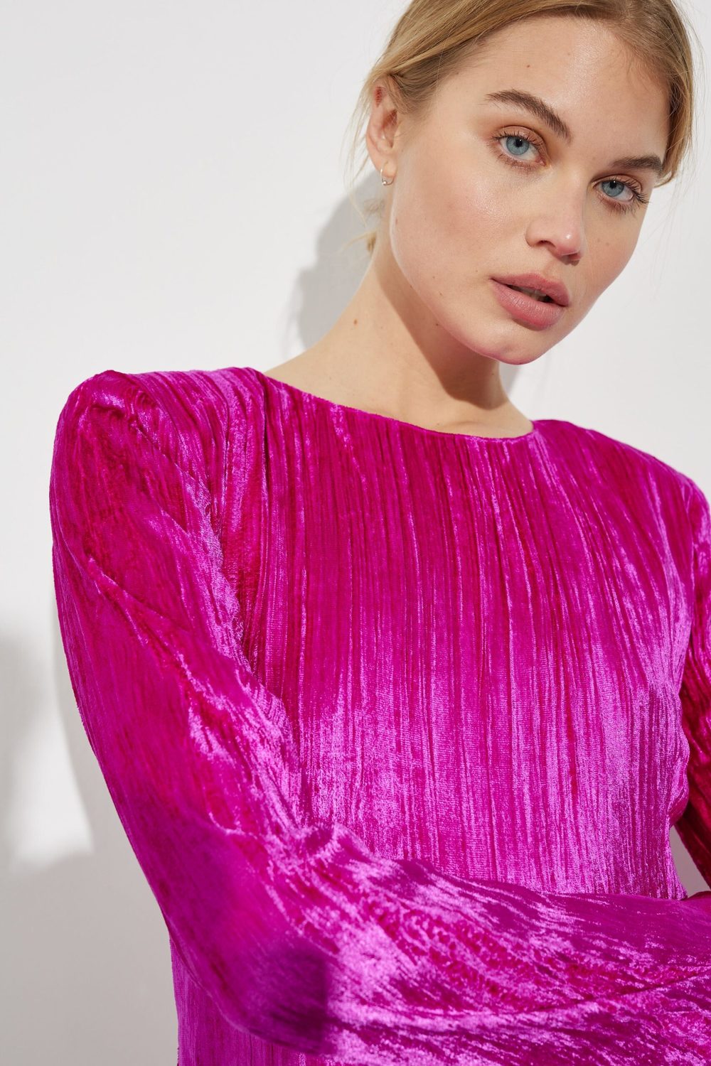 Kjolen kommer med åpen rygg, i en myk velour-kvalitet.