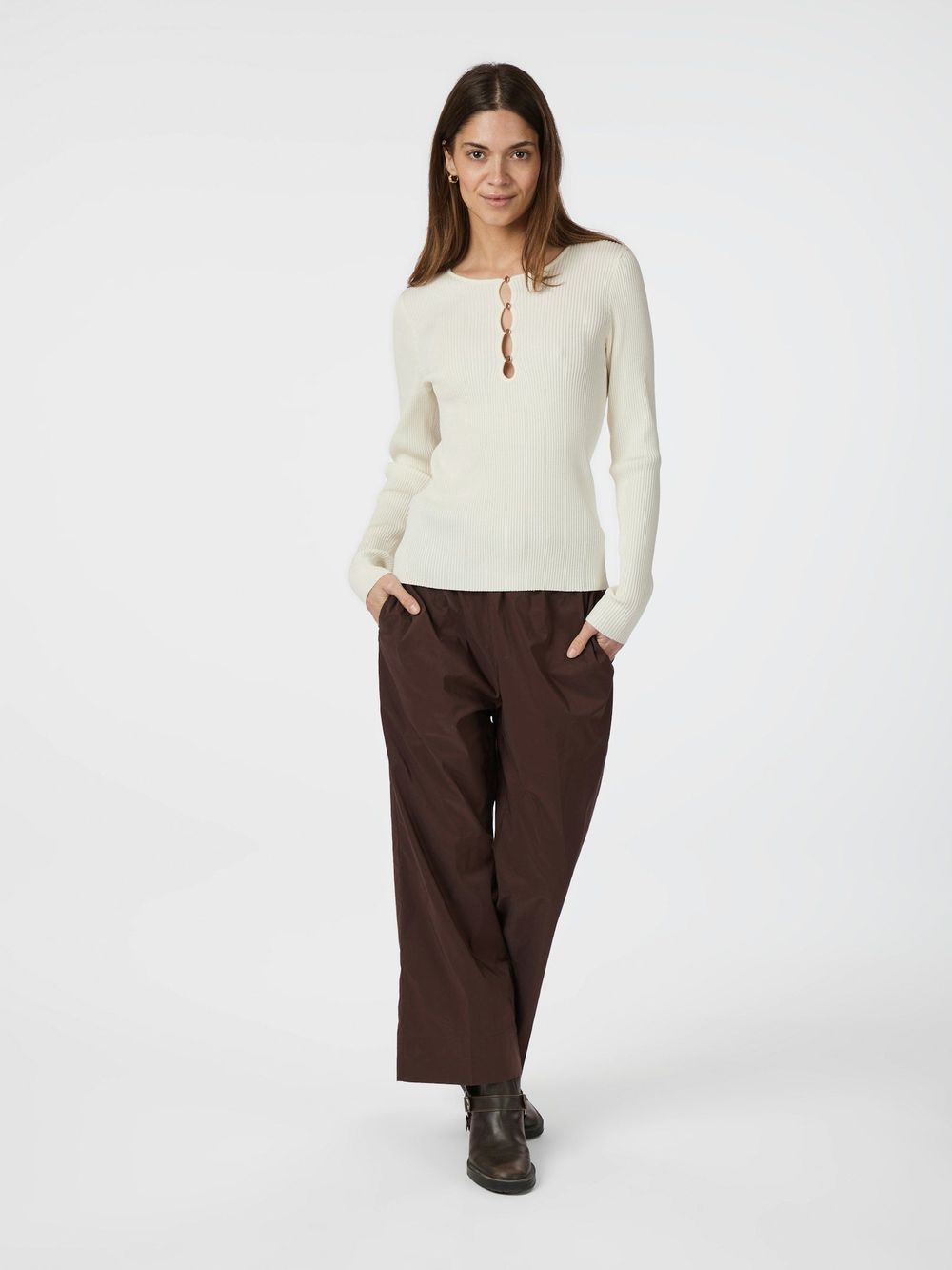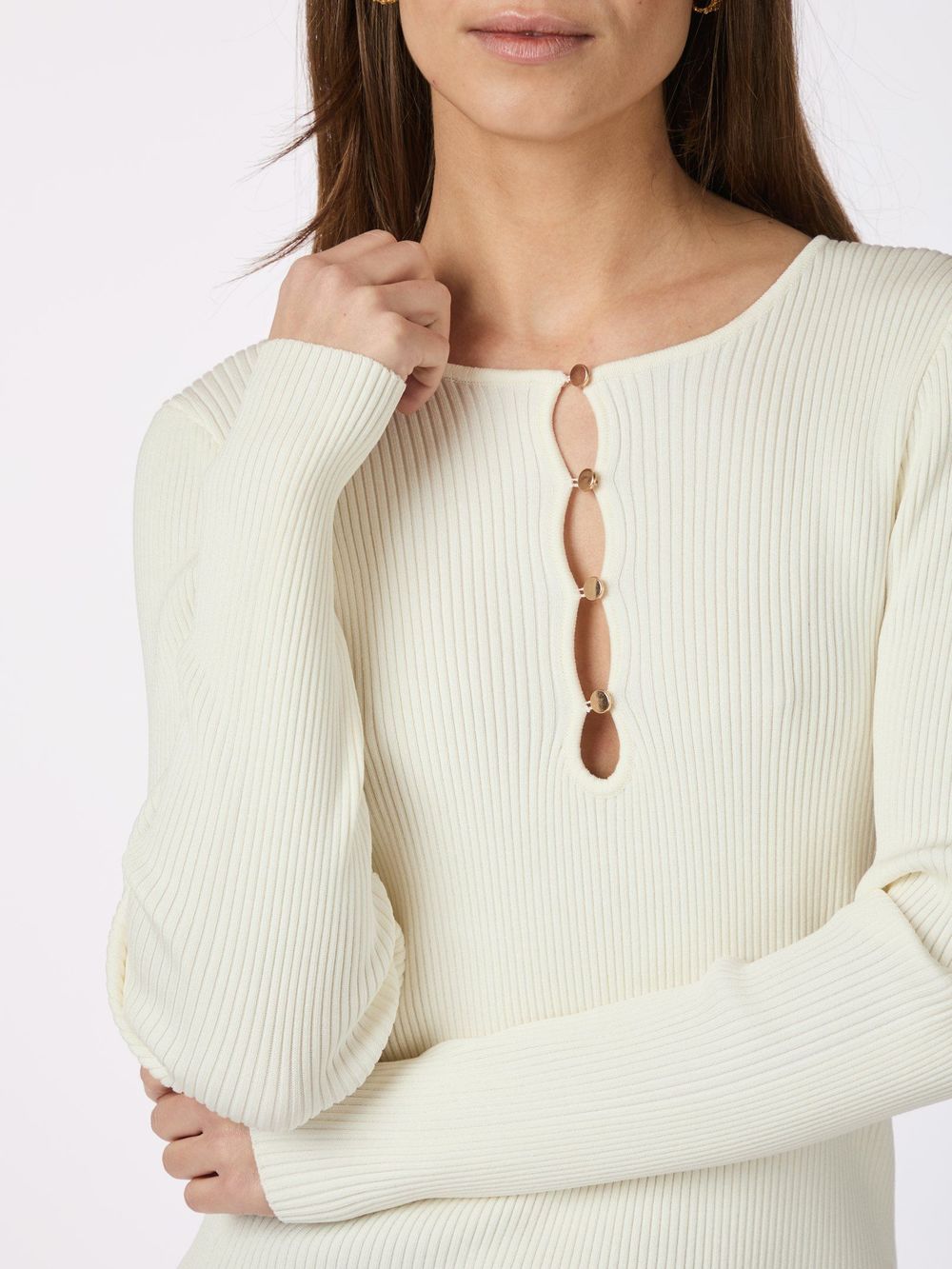 Enkel, genser i ribb kvalitet med gullknapper i utringingen.