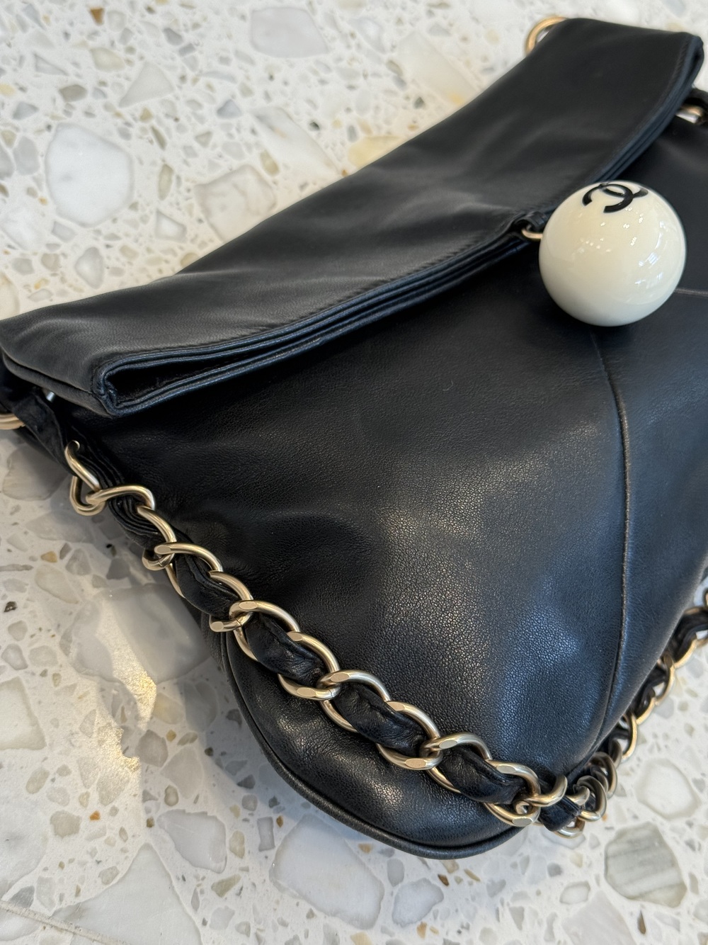 Den har...Chanel Shoulder Bag veske i svart skinn med en lekker detalj, en Chanel kule. Vesken er fra 2003/2004. Svart innside med CC logo mønster.