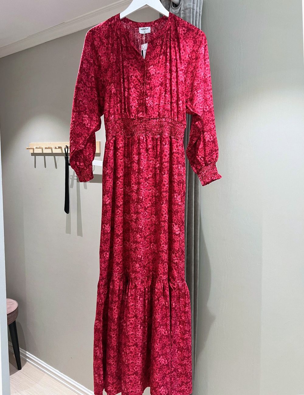 Denne kjolen er fotsid, har strikk i midjen og har knappe åpning i front.