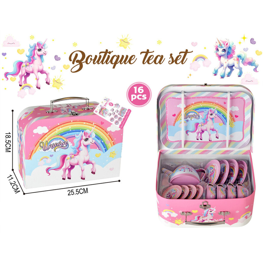 Dette nydelige koppesettet i tinn kommer i en flott koffert med enhjørningmotiv og inneholder alt som trengs for fantasifulle teselskaper. Med 16 deler, inkludert kopper,...Dette nydelige koppesettet i tinn kommer i en flott koffert med enhjørningmotiv og inneholder alt som trengs for fantasifulle teselskaper. Med 16 deler, inkludert kopper, fat, tekanne og serveringsbrikke, er dette settet perfekt for barn som elsker rollelek og magiske øyeblikk.