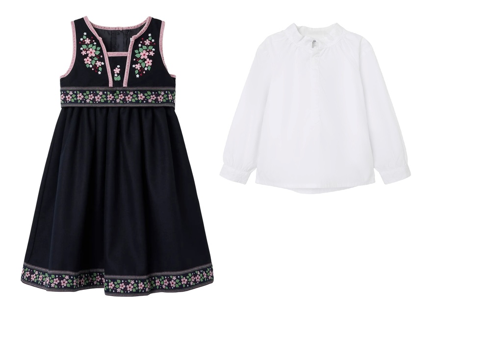 Festdrakt fra Name It i nydelig marine ullstoff og blomster broderi. Pene detaljer og bånd, med røde blomster. Drakten er litt stor i størrelsen. Levers... Les mer