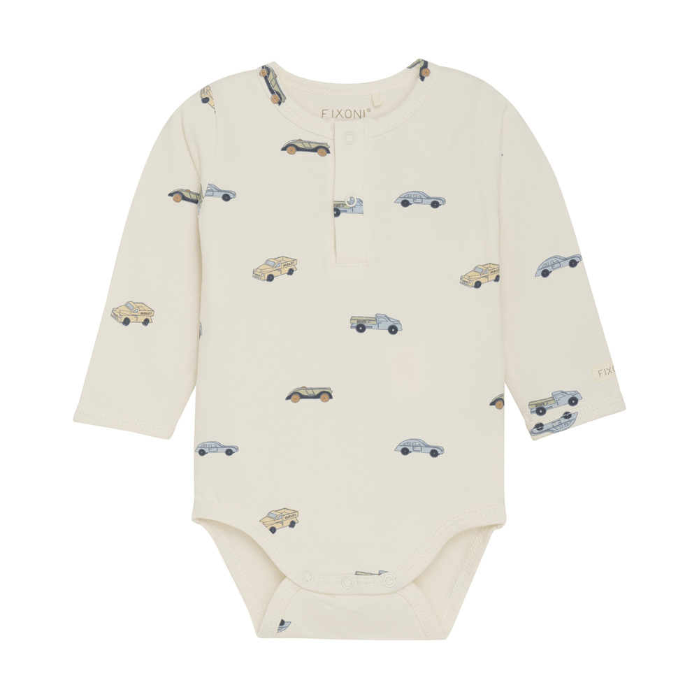 Langermet body fra Fixoni i myk økologisk bomull med bil print, trykknappåpning i stolpe ved hals og i bunn. 95% øko bomull 5% elastan