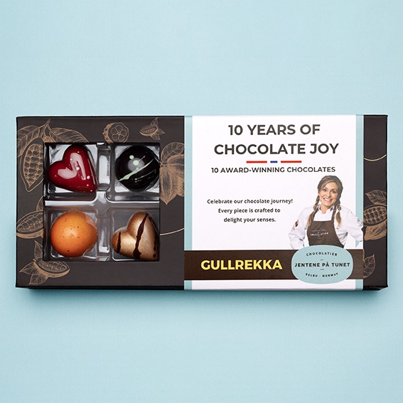 Gjennom årene har vi vunnet en rekke nasjonale og internasjonale priser. I denne unike esken finner du 10 prisvinnende sjokoladebiter...Feir vårt 10-årsjubileum med 10-biter Gullrekka!