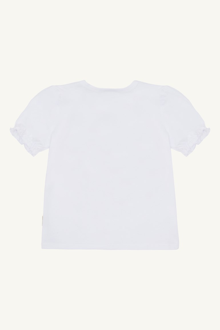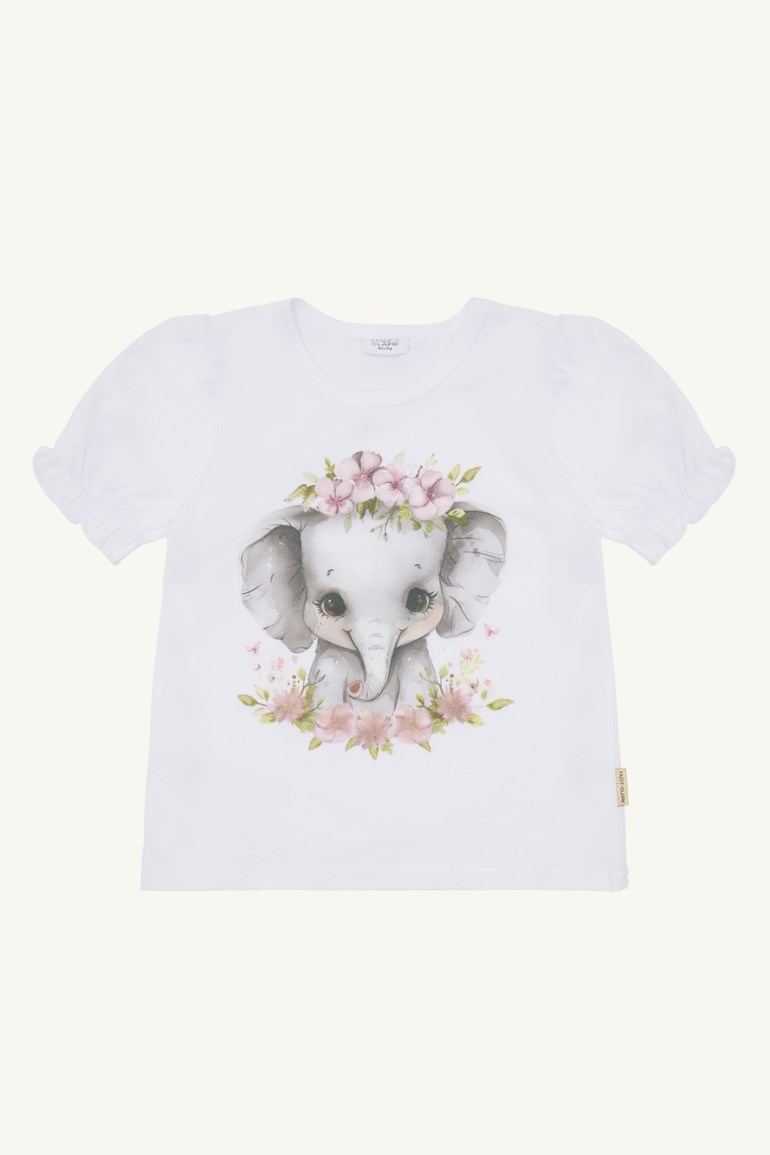 Alma t-skjorte er en myk og elastisk kortermet t-skjorte laget av 95 % økologisk bomull. Den har rynker på skuldrene og elastiske ermer for en...Alma t-skjorte er en myk og elastisk kortermet t-skjorte laget av 95 % økologisk bomull. Den har rynker på skuldrene og elastiske ermer for en fin passform. Fronten er dekorert med et elefantmotiv pyntet med blomster, og modellen har knappelukking i halsen fra størrelse 56-80 for enklere påkledning.