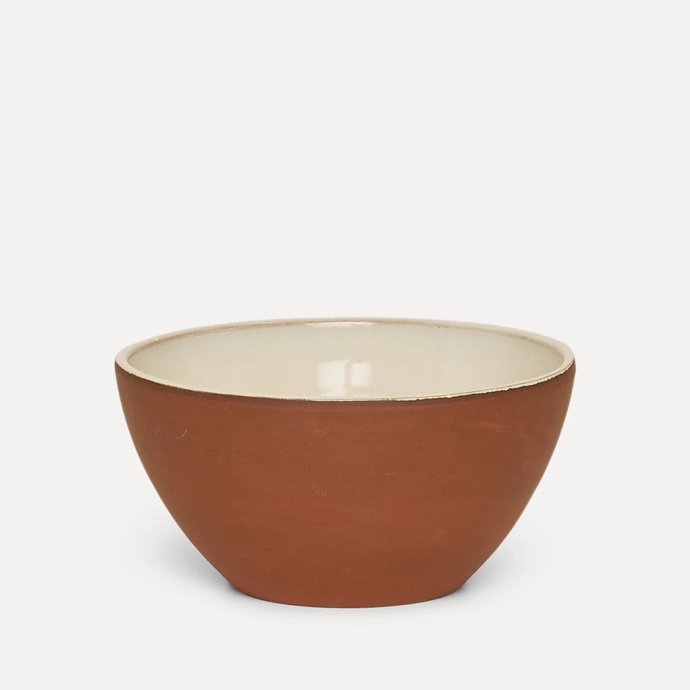 Bollen har den karakteristiske finishen som kjennetegner serien: Innsiden er glasert for enkel rengjøring og trygg matbehandling, mens utsiden er holdt i rå, ubehandlet terrakotta. Dette gir bollen et autentisk uttrykk og et godt, taktilt grep.
