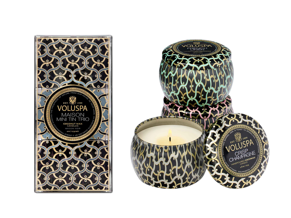 Gavesettet inneholder Bestselgerne Crisp Champagne, Saijo Persimmon og French Linen.
