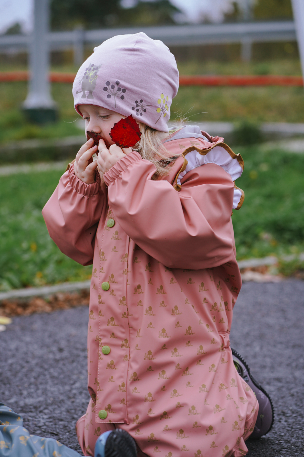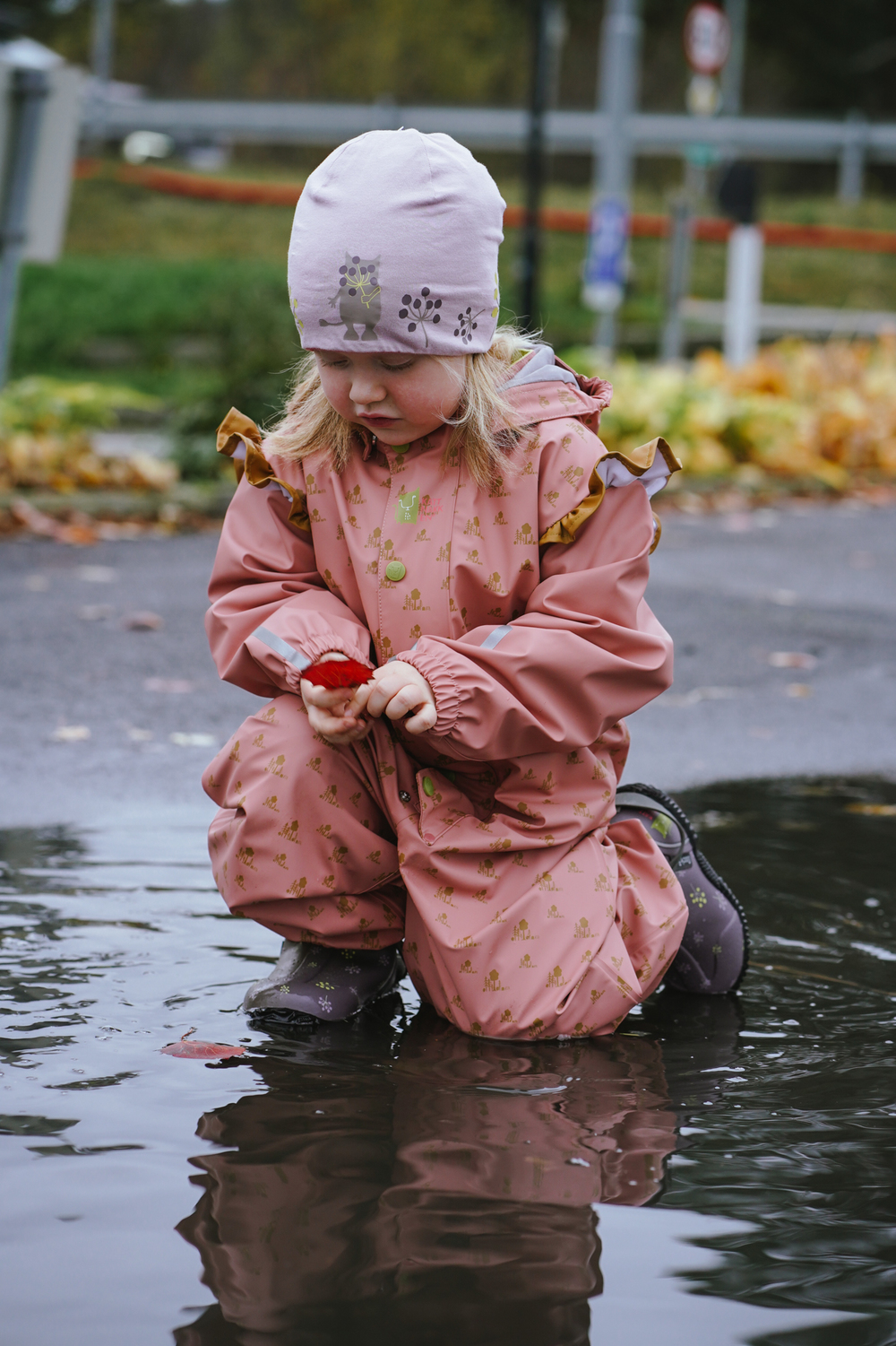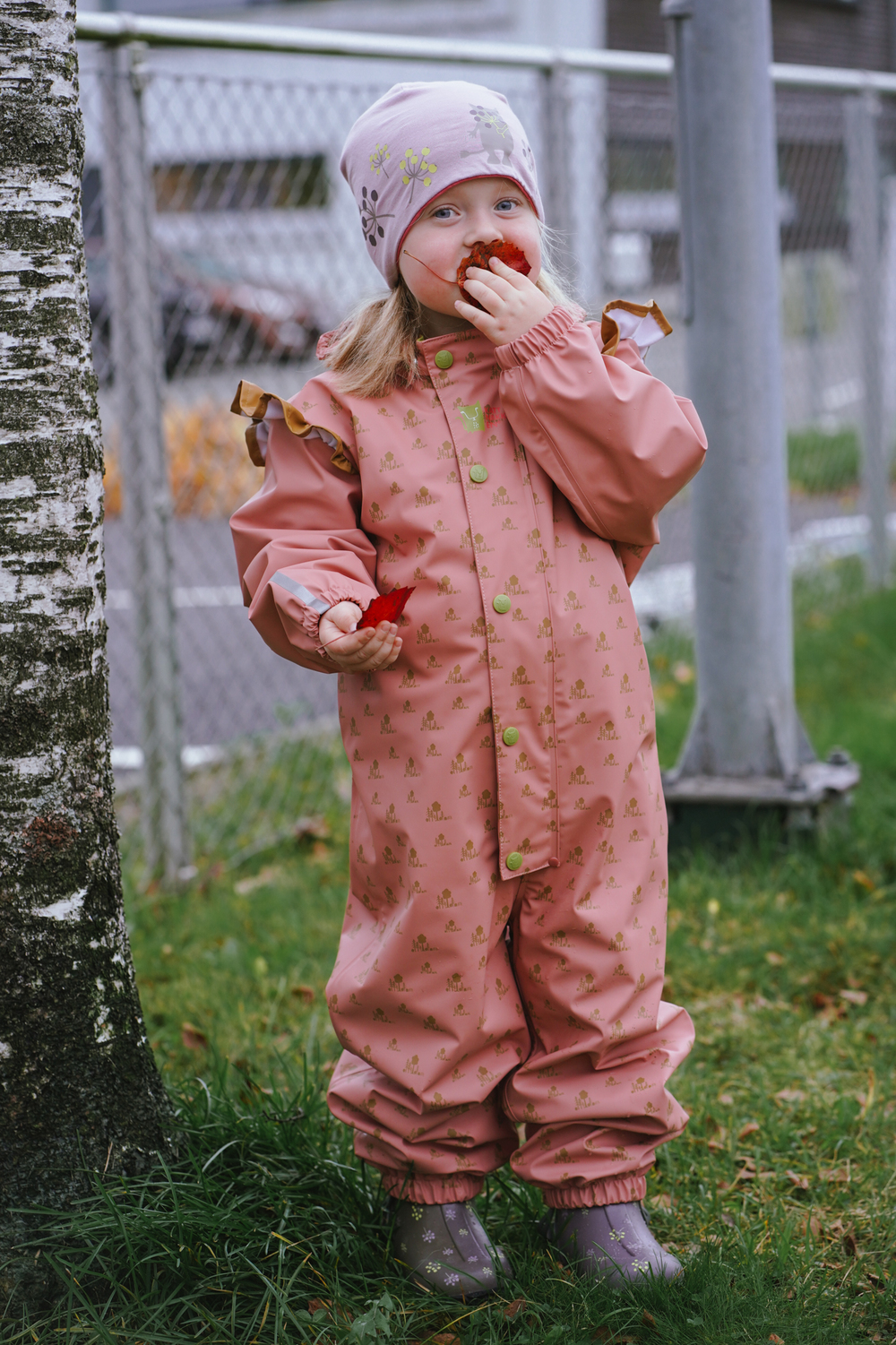 Regndressen er stor i størrelsen. Det er ikkje behageleg for bornet å bruke for store klede. Då mistar dei sin bevegelsesfrihet når dei er ute og leikar, og plagget blir slitt feil.