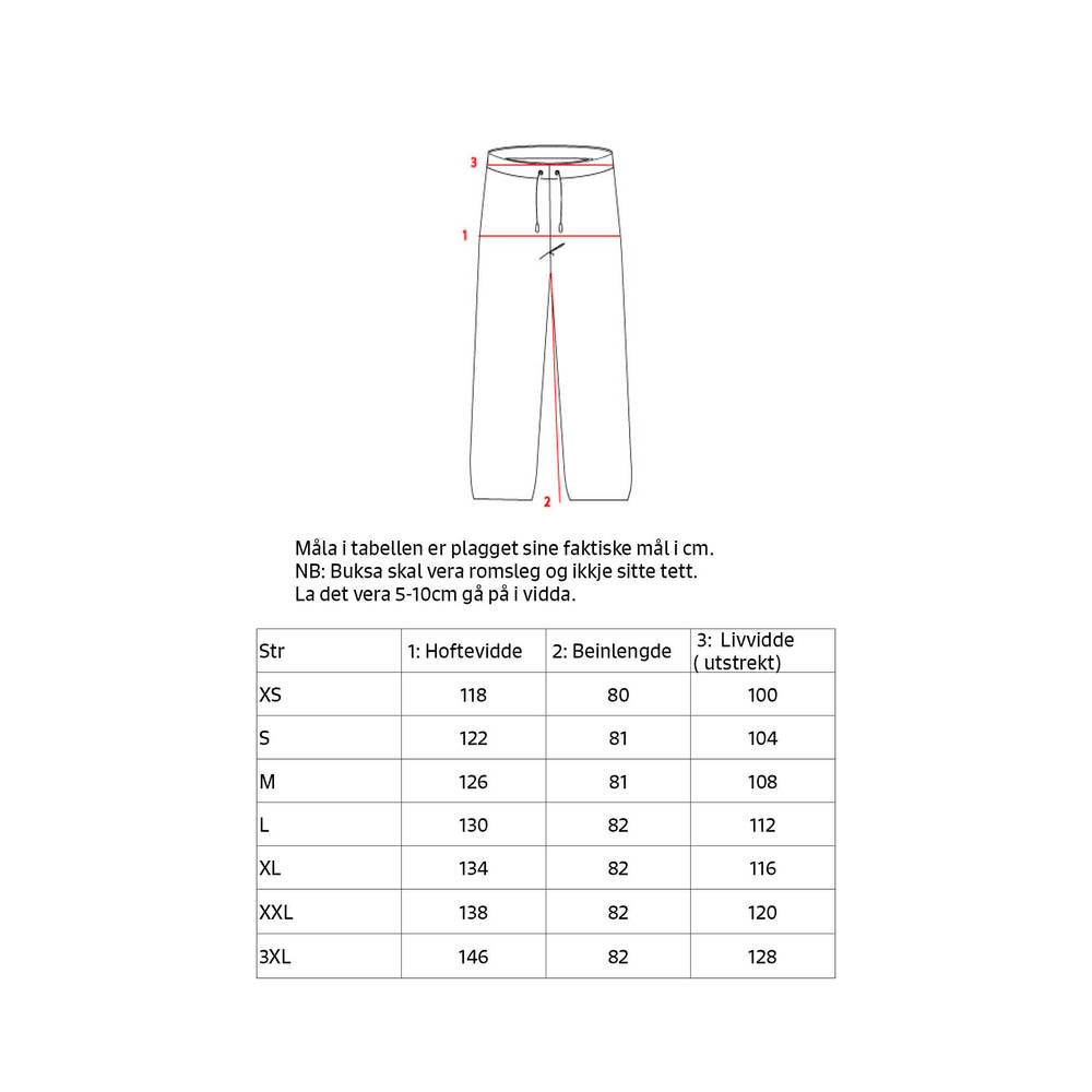 Buksa er romsleg i størrelsen, men hugs at gummiert stoff ikkje bør sitte for stramt over baken eller knea, da det kan skade stoffet. Sørg for litt ekstra plass for komfort.