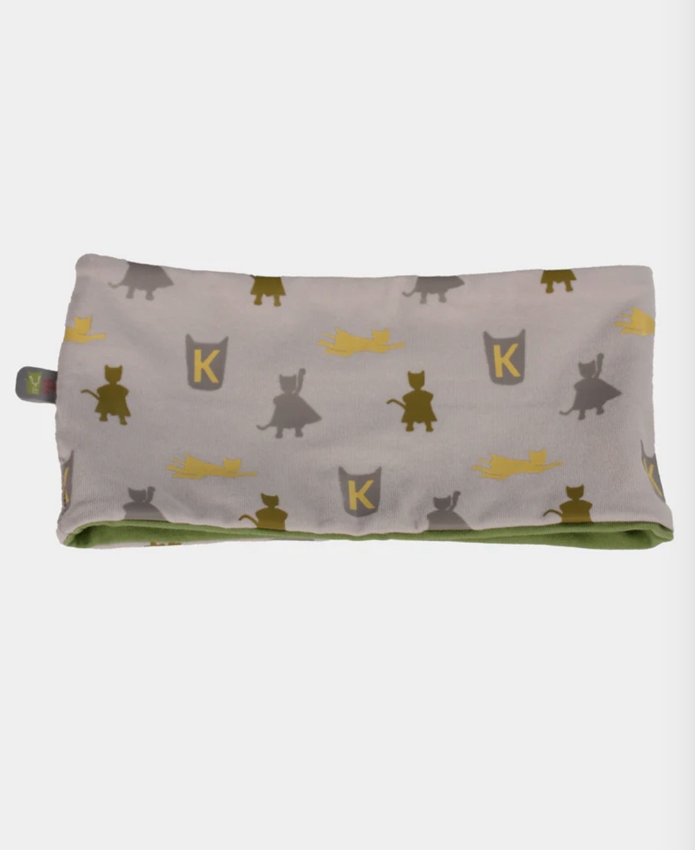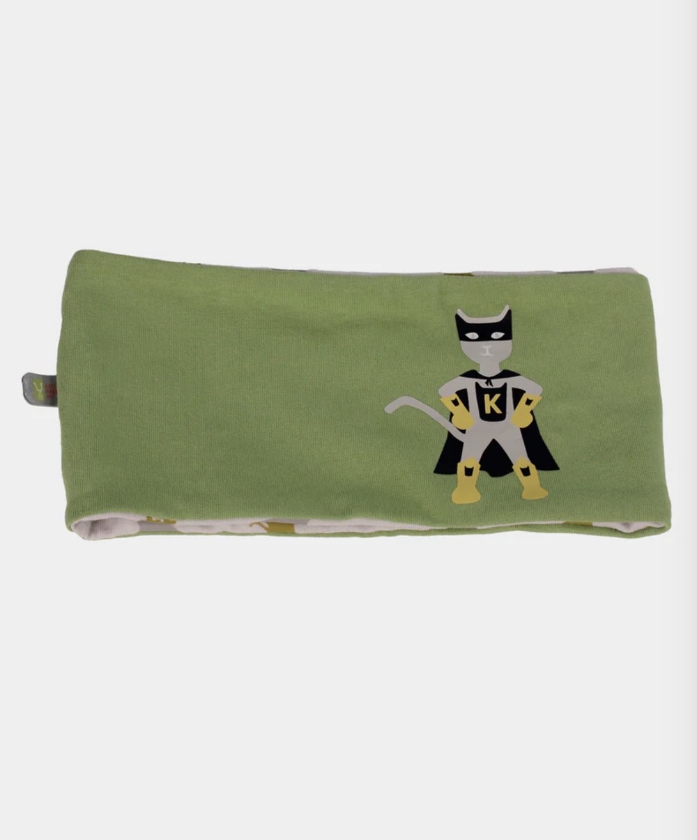 Panneband i mjuk bomull med print frå kolleksjon "Superkatten - 2026". Pannebandet kan vendast og brukast på begge sider.