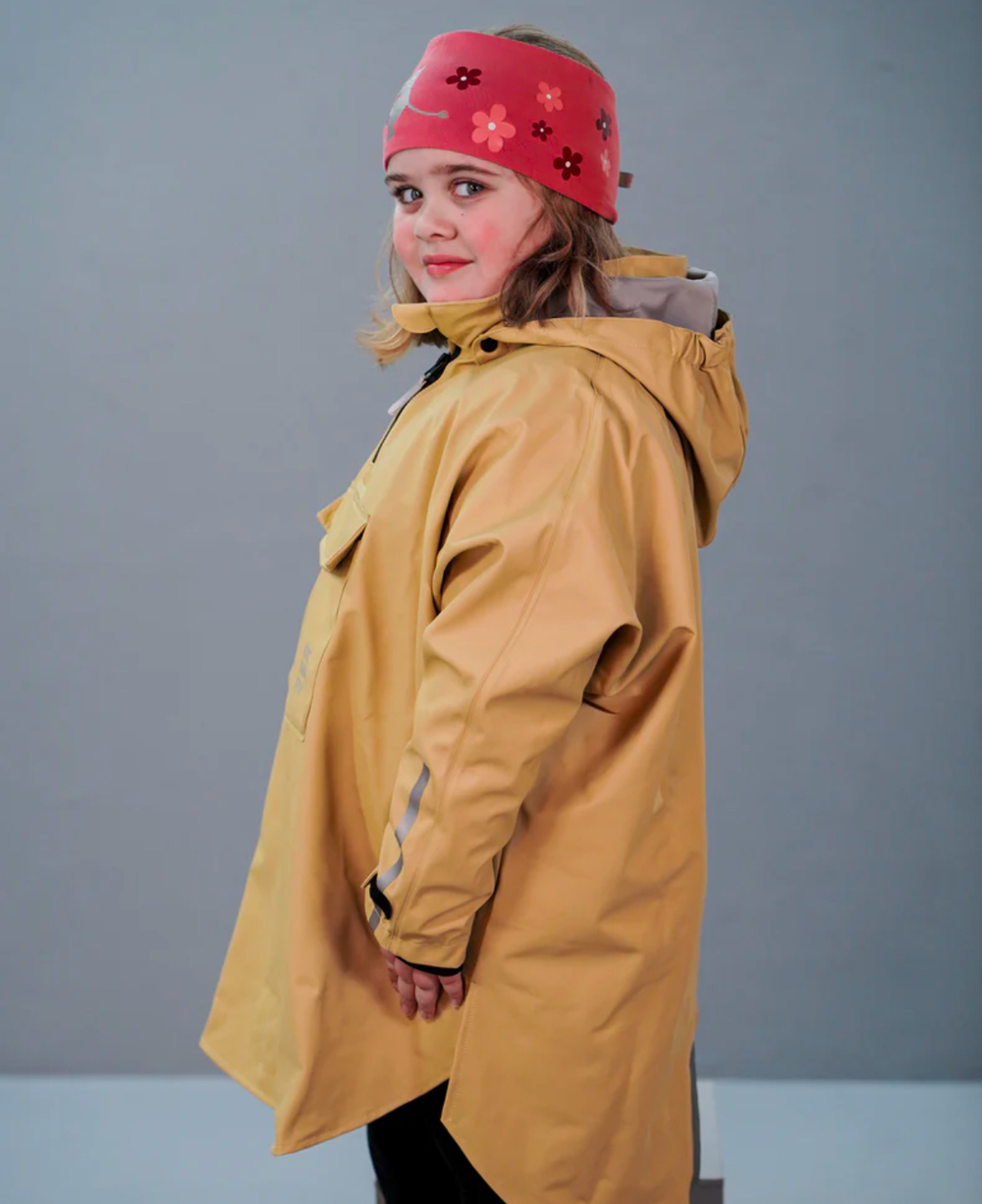 Lomme...Regnponcho med ermer i mjuk PU knit som gir fint fall. Passformen er laus og størrelsane gode. Dette gjev moglegheit til betre bevegelse i leik.