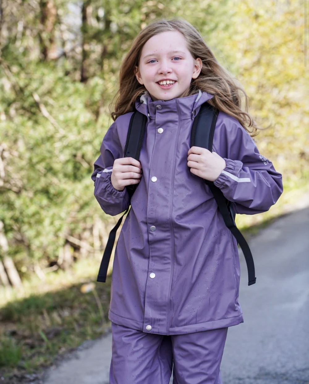 Eit slitesterkt regnsett med børsta innside på både jakke og bukse. Skjult "mobillomme" i front på jakka, refleksar på både jakke og bukse. Regulerbar strikk... Les mer