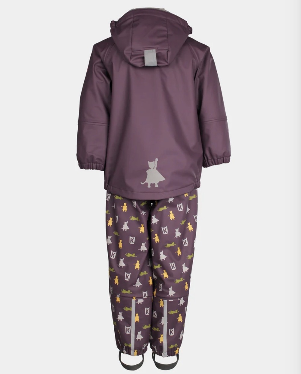 Settet er fullt av gjennomtenkte detaljar som gjer ein forskjell i kvardagen. Vannstopparar på armar og bein hindrar vatn i å trekke inn, medan slitesterke strikkar under foten held buksa godt på plass over støvlane. Jakka har mjuk fleece på innsida av kragen for ekstra komfort mot haka, og refleksar på både jakke og bukse gjer barnet godt synleg ute.