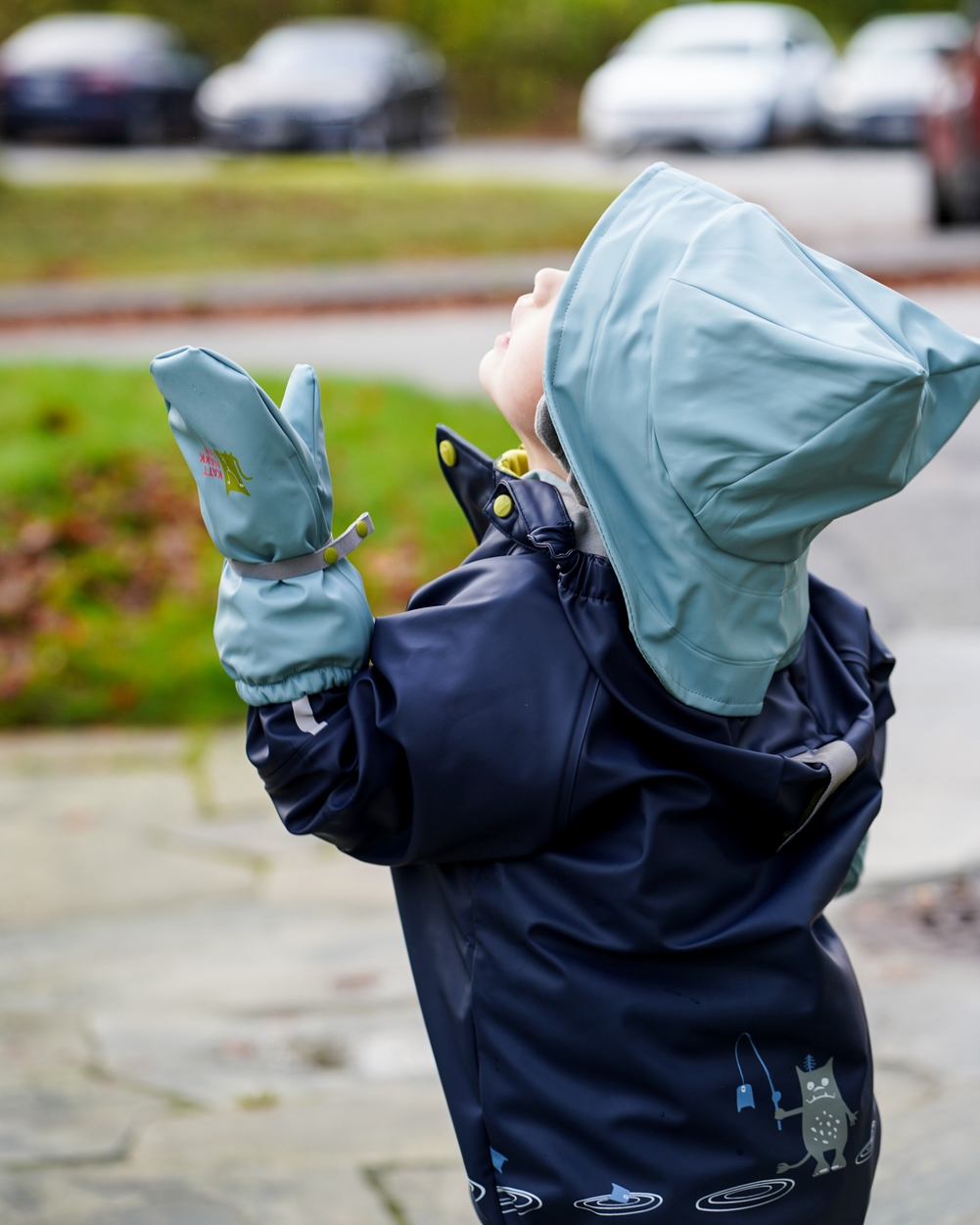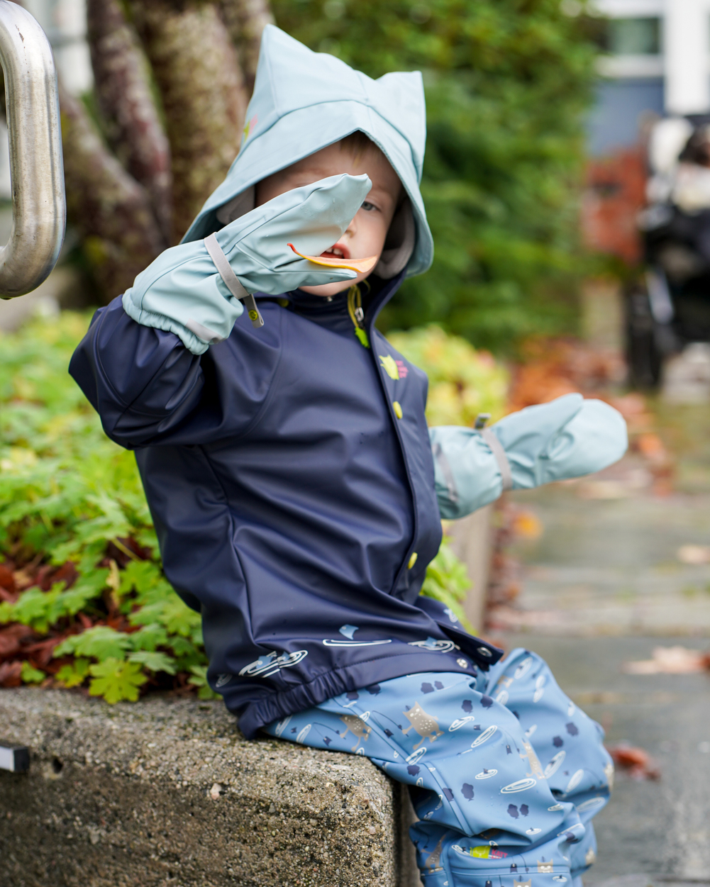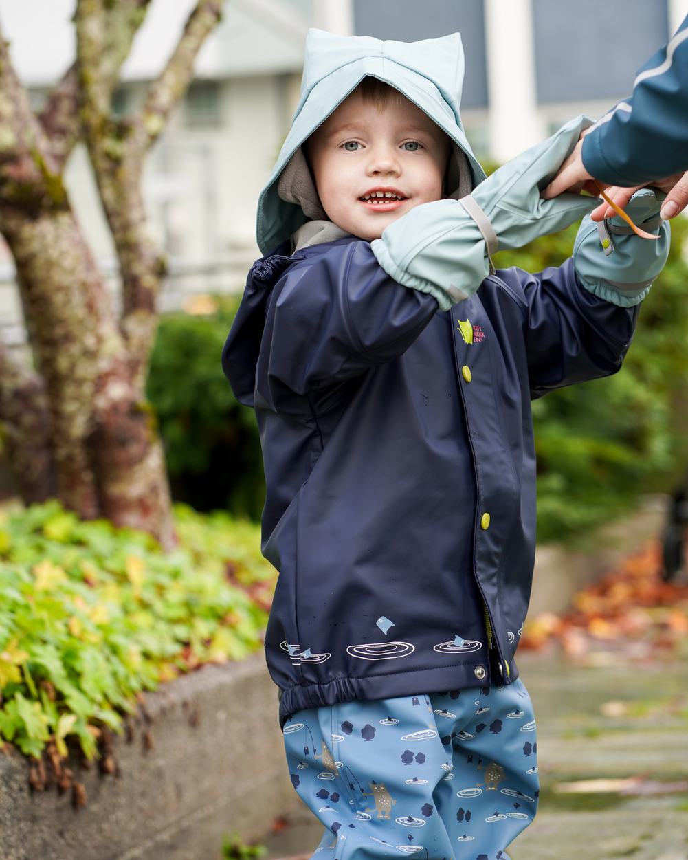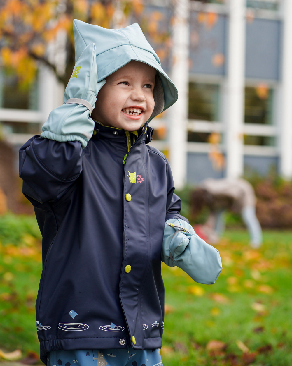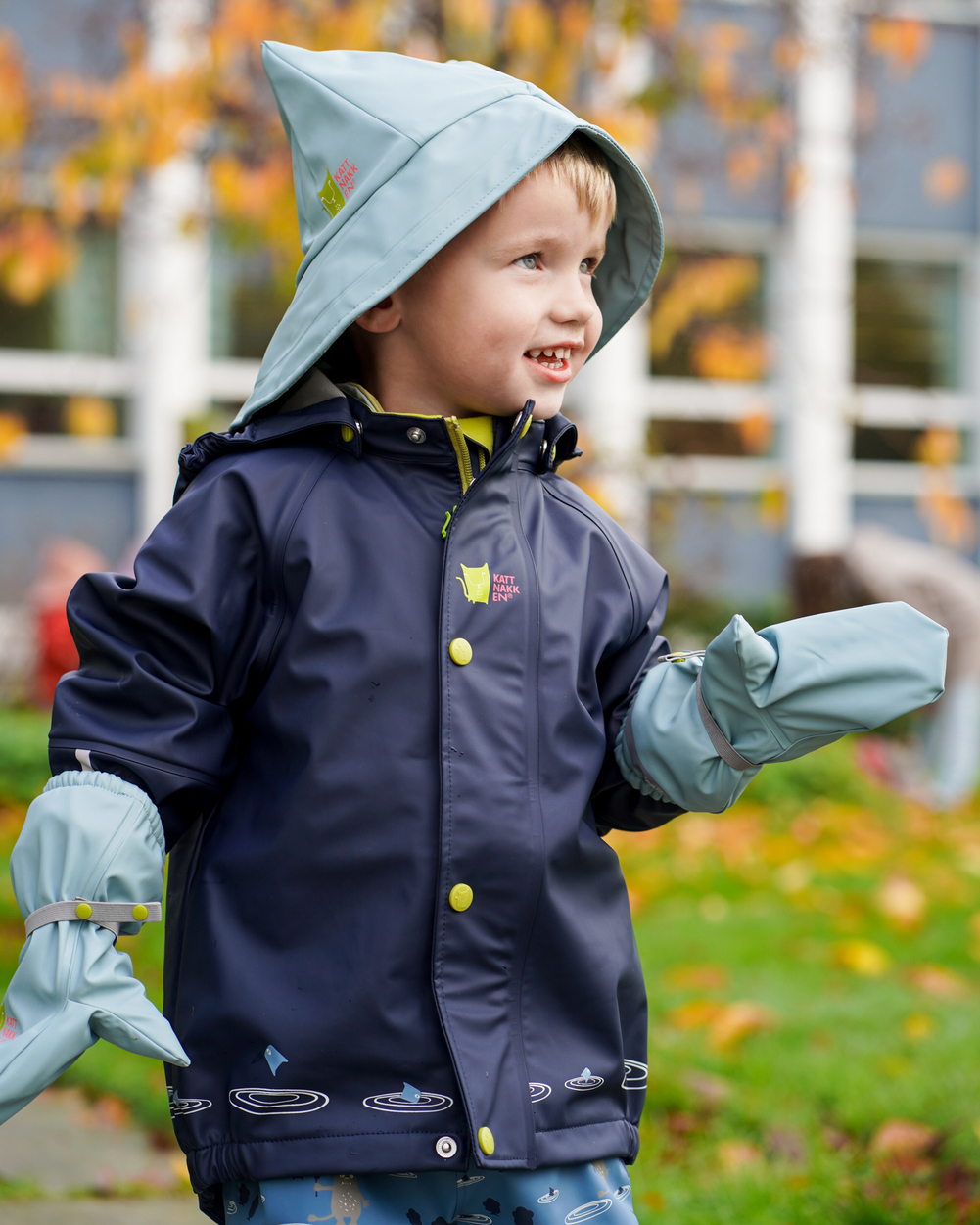 Kattnakken Plask! Her er både jakke og bukse i same gode PU kvalitet, med børsta innside. Det er mjuk fleece på insida av kragen og...Kattnakken Plask! Her er både jakke og bukse i same gode PU kvalitet, med børsta innside. Det er mjuk fleece på insida av kragen og vannstopper finst i både ermer og bein. Her er det slitesterk gummistrikk under føtene, refleksar på jakke og bukse, og mykje moro i print og andre detaljar. Sveisa saumar og sikker hette som er både avtagbar og regulerbar.