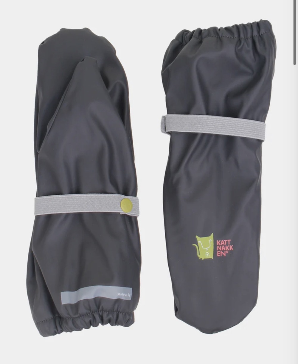 Regnvottar i mjuk kvalitet (PU) med fleecefòr og namnelapp på begge vottane. Held små hender varme sjølv om det øser og pøser ned.