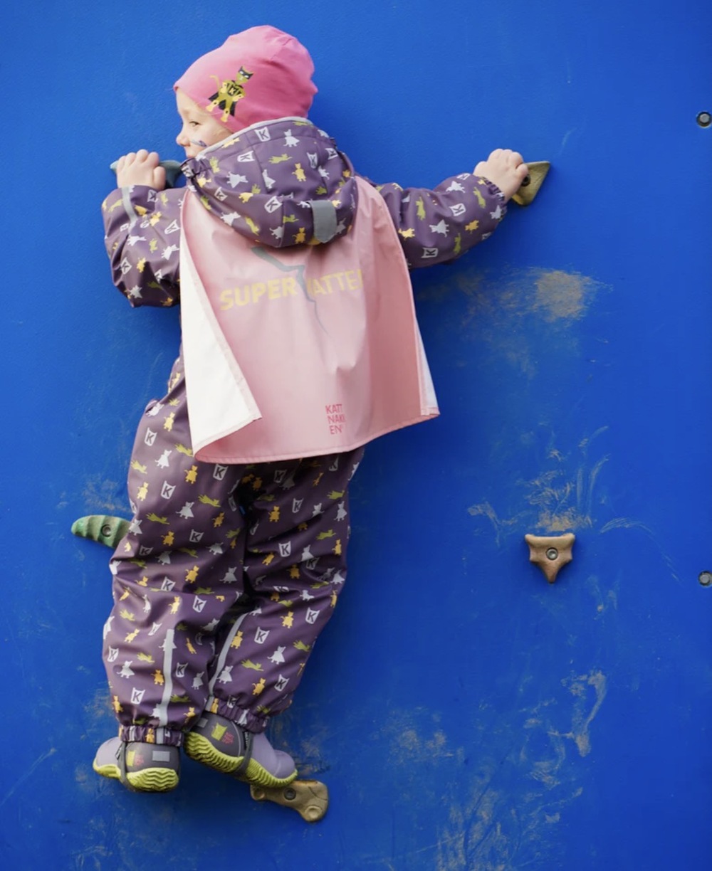 Denne lause superheltkappa frå kolleksjonen Superkatten 2026 kan festast på nesten alt regntøy i kolleksjonen vår (NB! gjeld ikkje Babyregndress Dugg). Me gjer det rett og slett berre på gøy – og fordi det skal vere lov å velje regntøy med eller utan kappe, alt etter humør og superheltambisjonar den dagen.