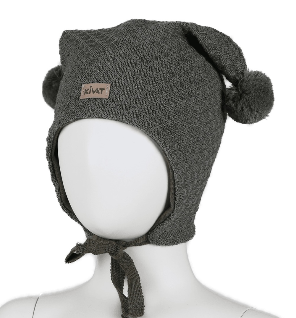 Fin vinterlue fra Kivat med dusker og knyting. Vaffelmønster. Skinnlapp i front.
