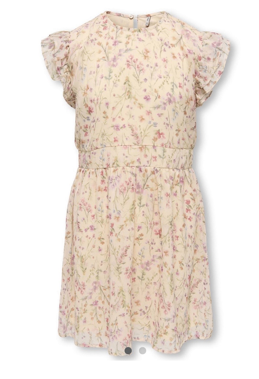 Utrolig søt kjole til barn og ungdom i mykt materiale. Kjolen har fint blomsterprint over hele og volanger over skuldrene. Myk strikk i midjen som...Utrolig søt kjole til barn og ungdom i mykt materiale. Kjolen har fint blomsterprint over hele og volanger over skuldrene. Myk strikk i midjen som gir fint fall.