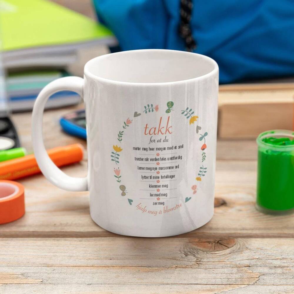 En herlig kopp til å ha på jobb når man trenger en pause. Fordi av og til må man lade batteriene. Kan vaskes i maskin.