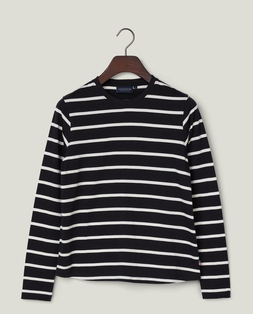 Den klassiske passformen og rund hals-designen gir en tidløs stil, mens de karakteristiske svarte og hvite stripene tilfører allsidighet til garderoben din. Med det karakteristiske flaggmerke i sidesømmen, kombinerer denne single jersey t-skjorten komfort med Lexingtons underspilte eleganse. Perfekt for lagvis påkledning eller for å brukes alene, fungerer dette essensielle plagget sømløst fra avslappede utflukter til rolige kvelder hjemme.