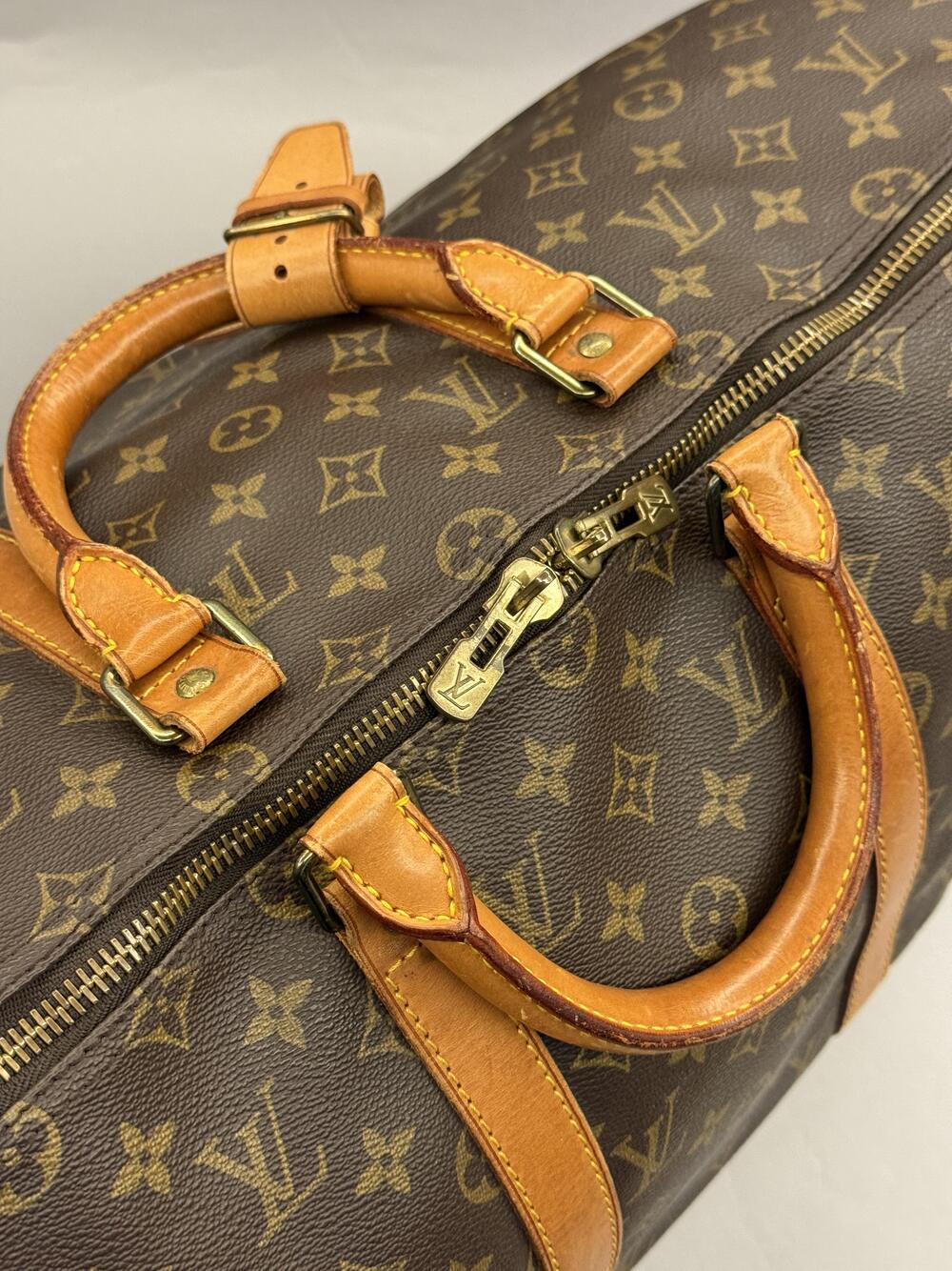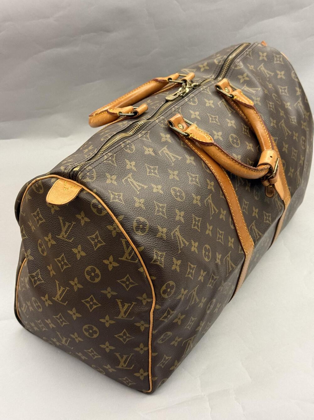 Louis Vuitton Keepall 50 i monogram canvas med detaljer i skinn og hardware i gullfarget messing. Den er fra 1991.