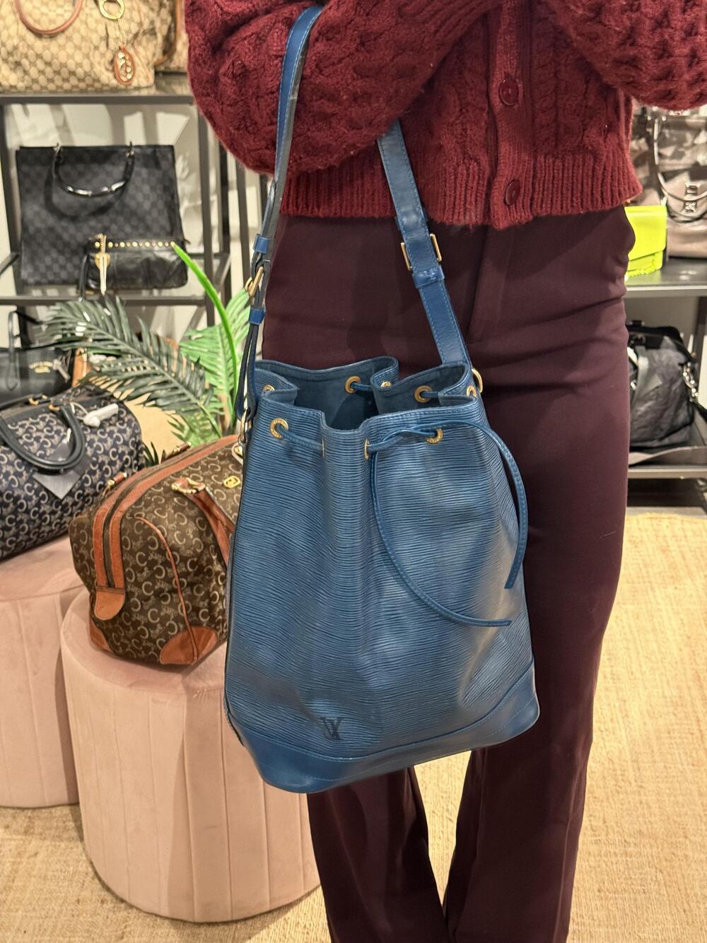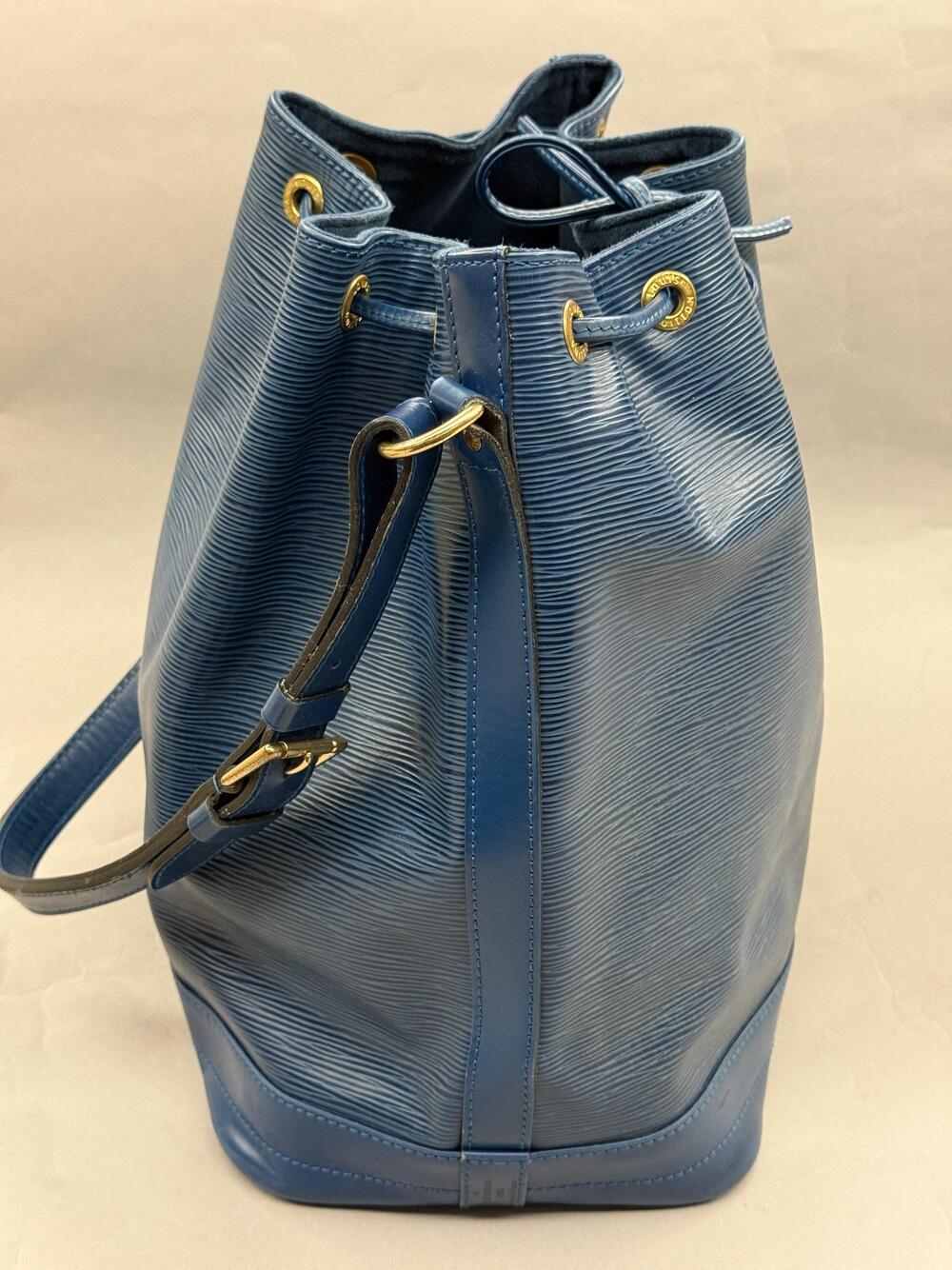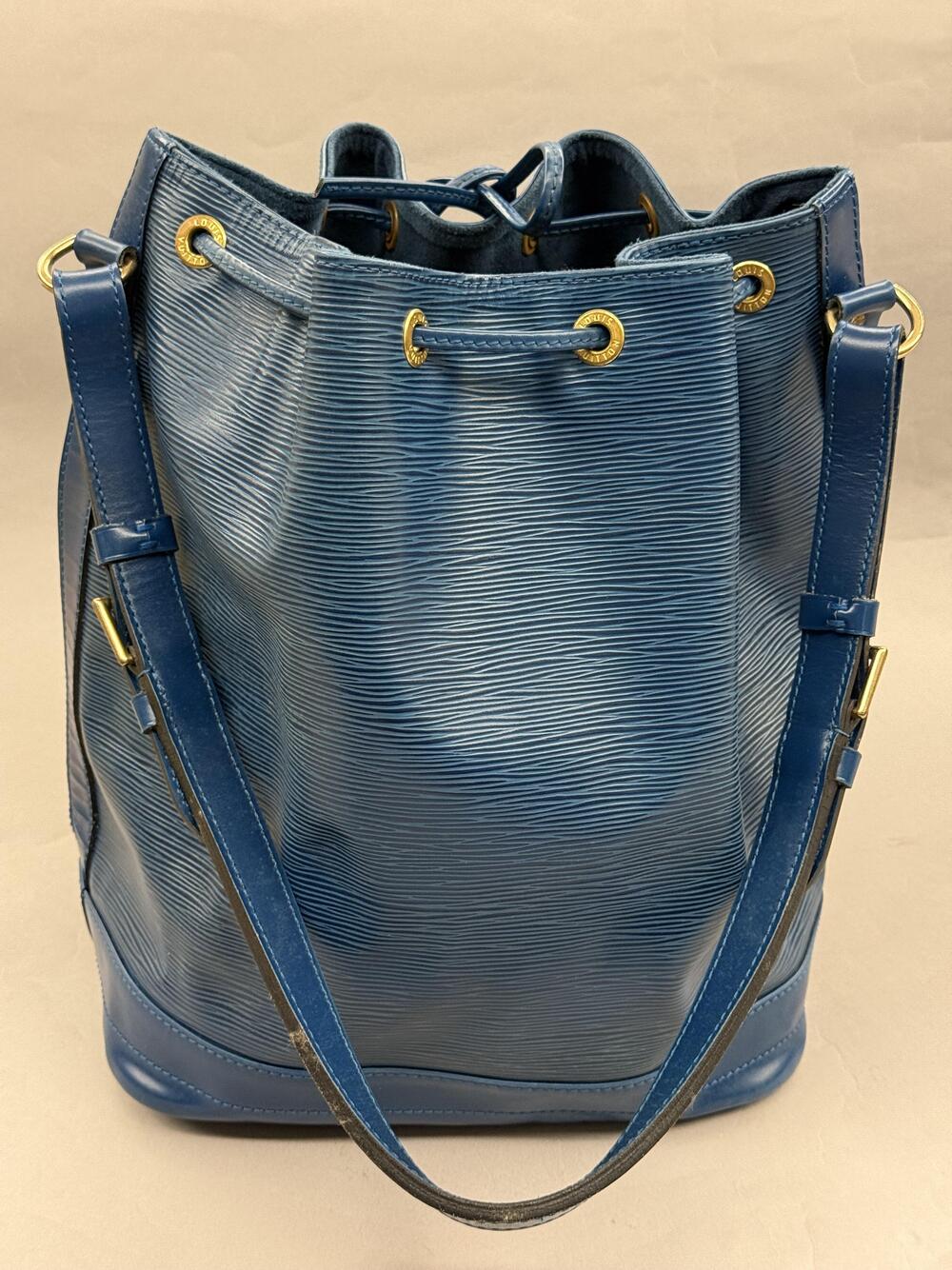 Louis Vuitton Epi Noé GM (den største) fra 1995, i blått skinn med hardware i gullfarget messing. Den har en stor lomme som lukkes med...Louis Vuitton Epi Noé GM (den største) fra 1995, i blått skinn med hardware i gullfarget messing. Den har en stor lomme som lukkes med drawstring og har regulerbar skulderreim.