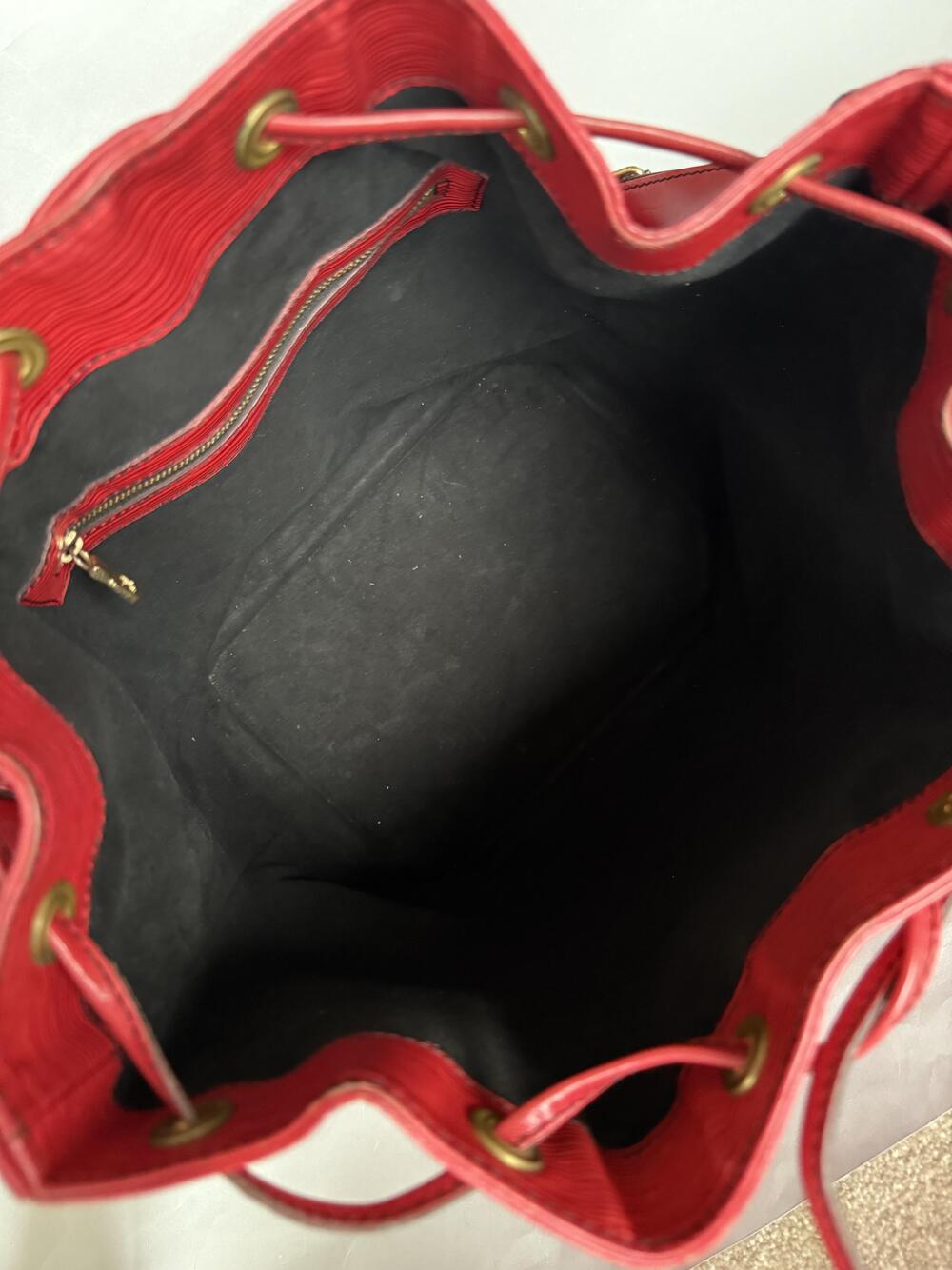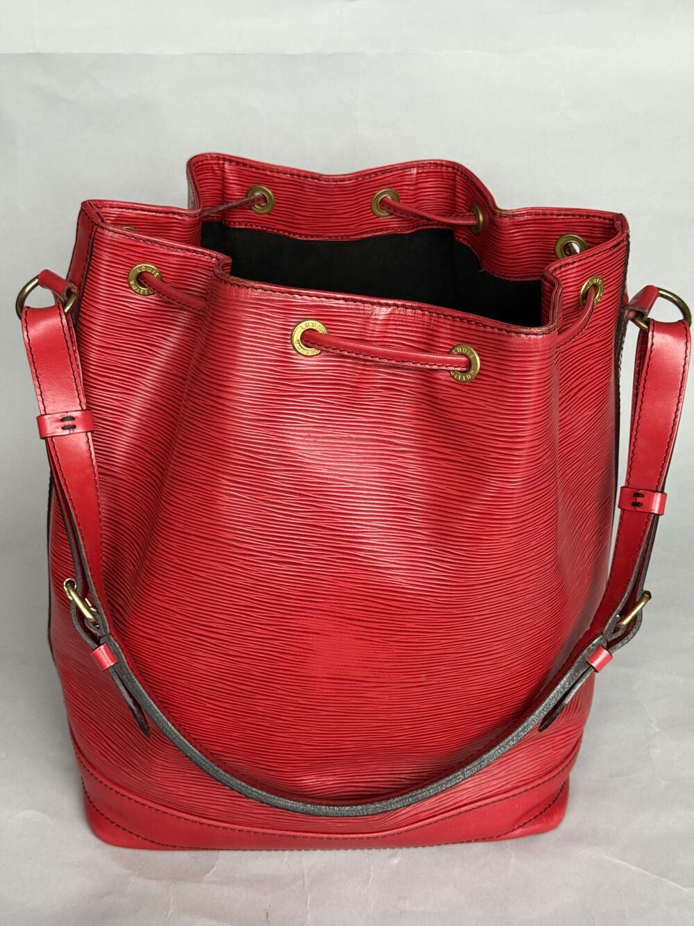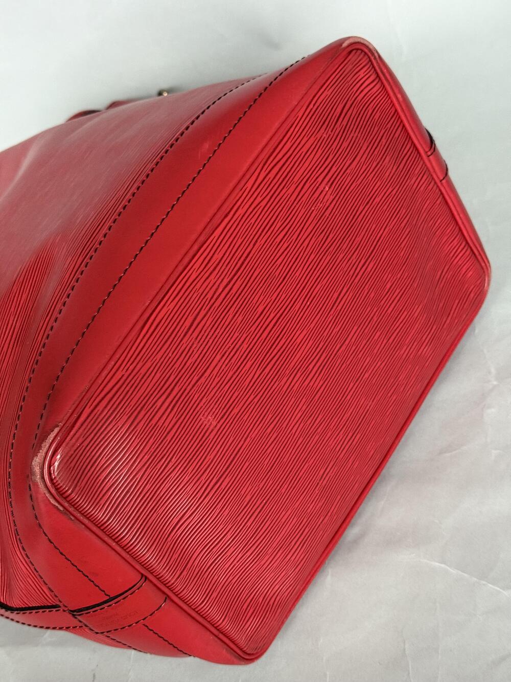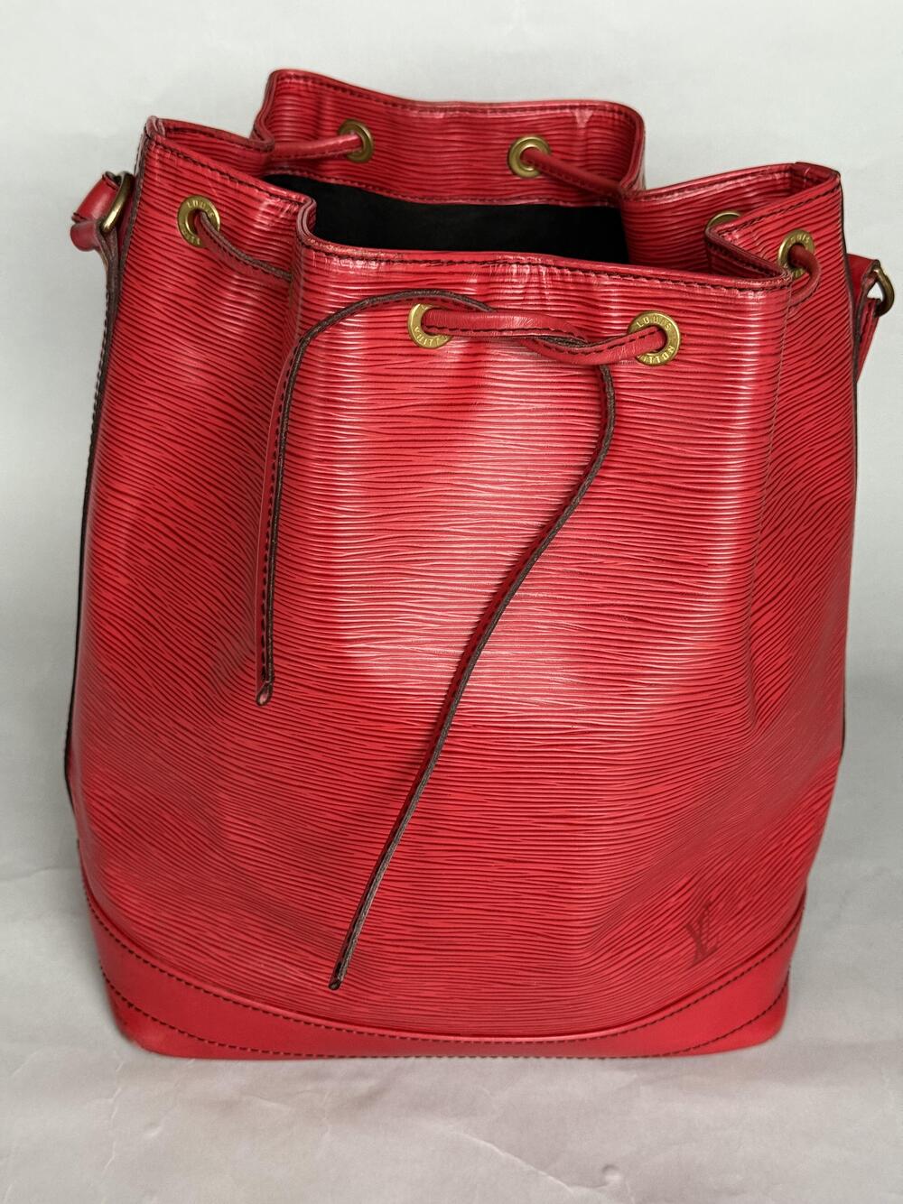 Louis Vuitton Epi Noé GM (den største) fra 1991, i rødt skinn med hardware i gullfarget messing. Den har en stor lomme som lukkes med...Louis Vuitton Epi Noé GM (den største) fra 1991, i rødt skinn med hardware i gullfarget messing. Den har en stor lomme som lukkes med drawstring og har regulerbar skulderreim. Lilla på innsiden.