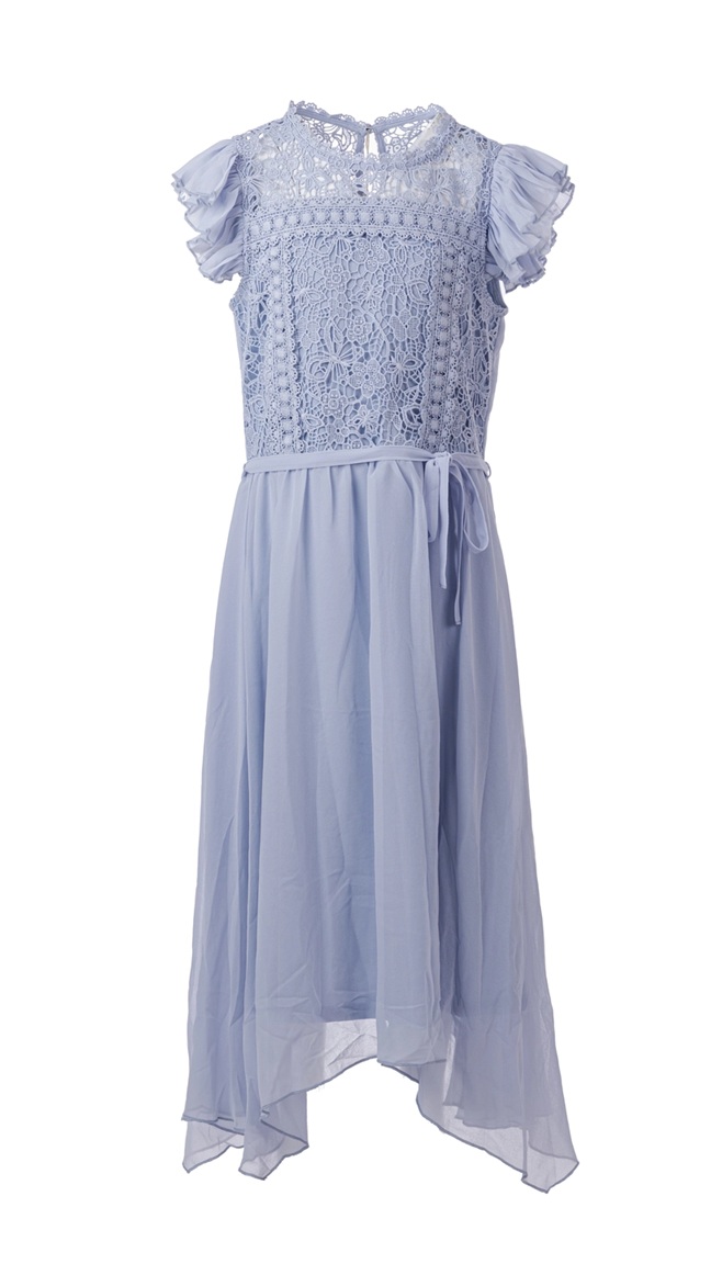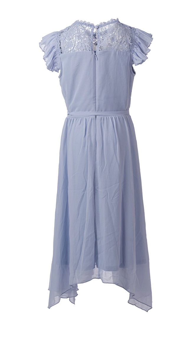 En elegant lyseblå kjole med blondetopp og lett, asymmetrisk chiffonskjørt. Overdelen har detaljert blomsterblonde. Kjolen lukkes med en liten knapp bak i nakken. Midjen markeres...En elegant lyseblå kjole med blondetopp og lett, asymmetrisk chiffonskjørt. Overdelen har detaljert blomsterblonde. Kjolen lukkes med en liten knapp bak i nakken. Midjen markeres av et smalt knytebelte i samme stoff. Luftig og lett. 100% Polyester, vaskes på 40 grader.Les mer