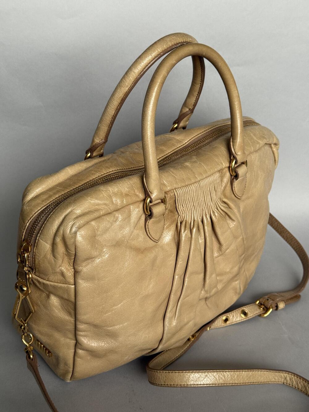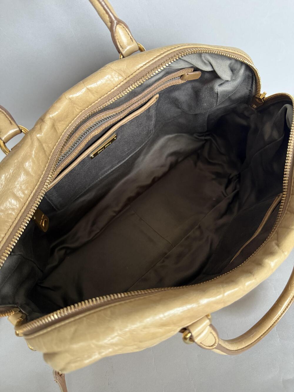 Miu Miu veske i beige Nappa Lux skinn med gullfarget hardware. Den har 1 stort rom med en glidelås lomme inni. Logo på siden.