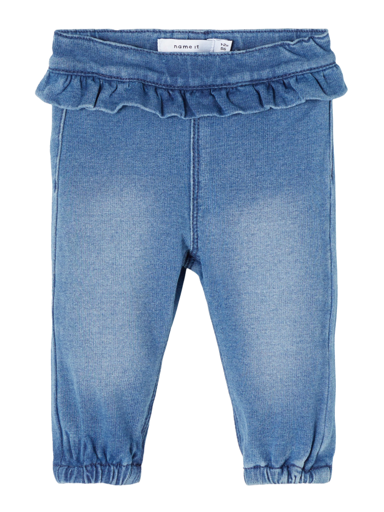 Myk jeans til baby. Denne er som en joggebukse. Søt rysjekant rundt midjen. Kan justeres i midejn med elastisk stramming. Buksen er noe mørkere enn...Myk jeans til baby. Denne er som en joggebukse. Søt rysjekant rundt midjen. Kan justeres i midejn med elastisk stramming. Buksen er noe mørkere enn bildet viser.