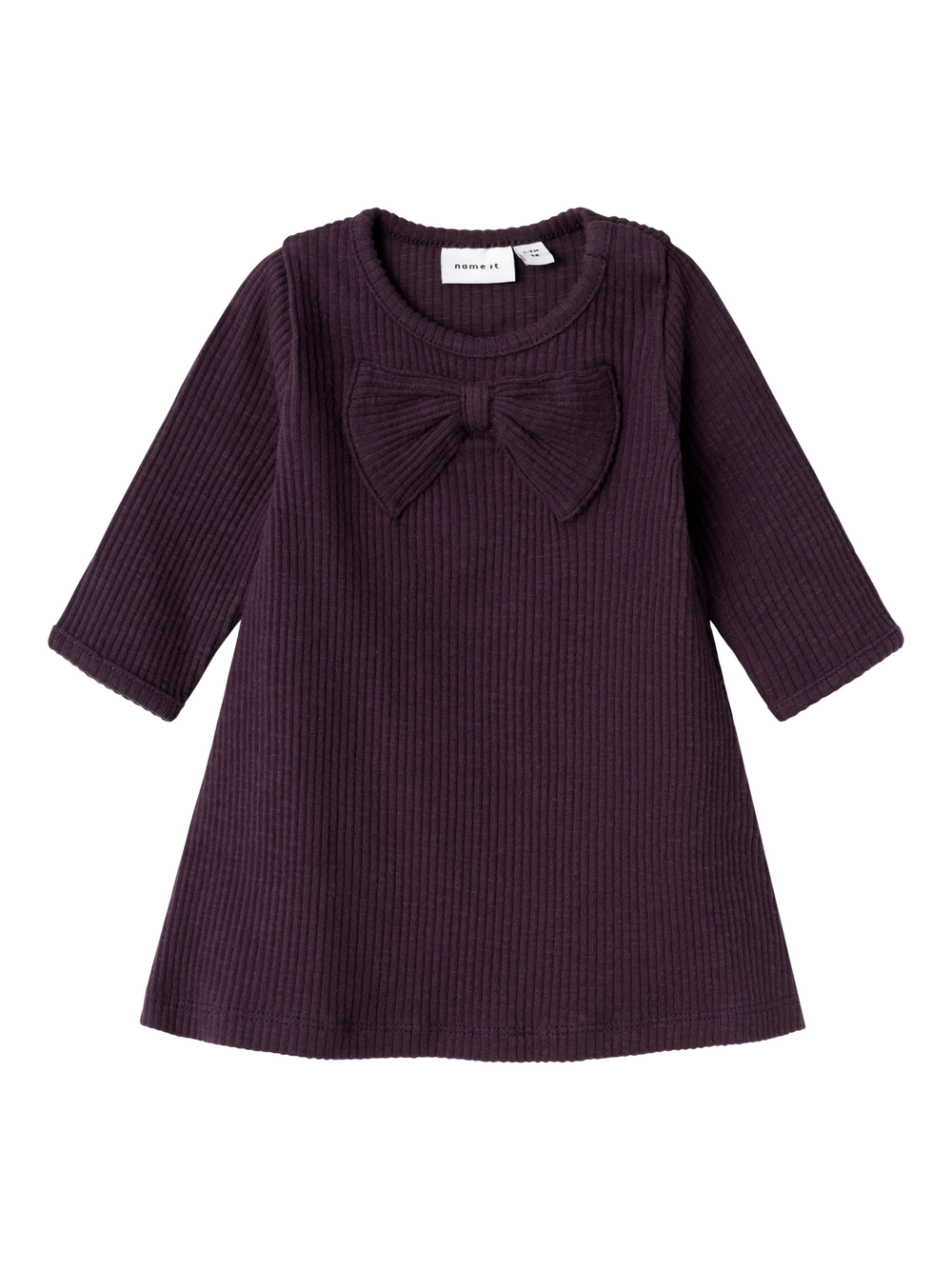 Søt kjole i litt grov ribb-struktur. Stor ton-i ton sløyfe i front. Myk og behagelig.