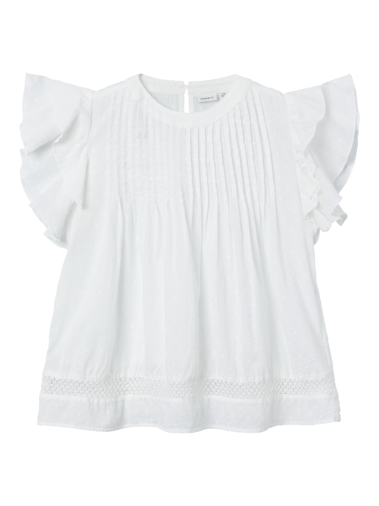 Kortermet bluse fra Name It i florlett 100% bomull med litt store rysje-kappe ermer og utsvingt fasong med blondekant nede