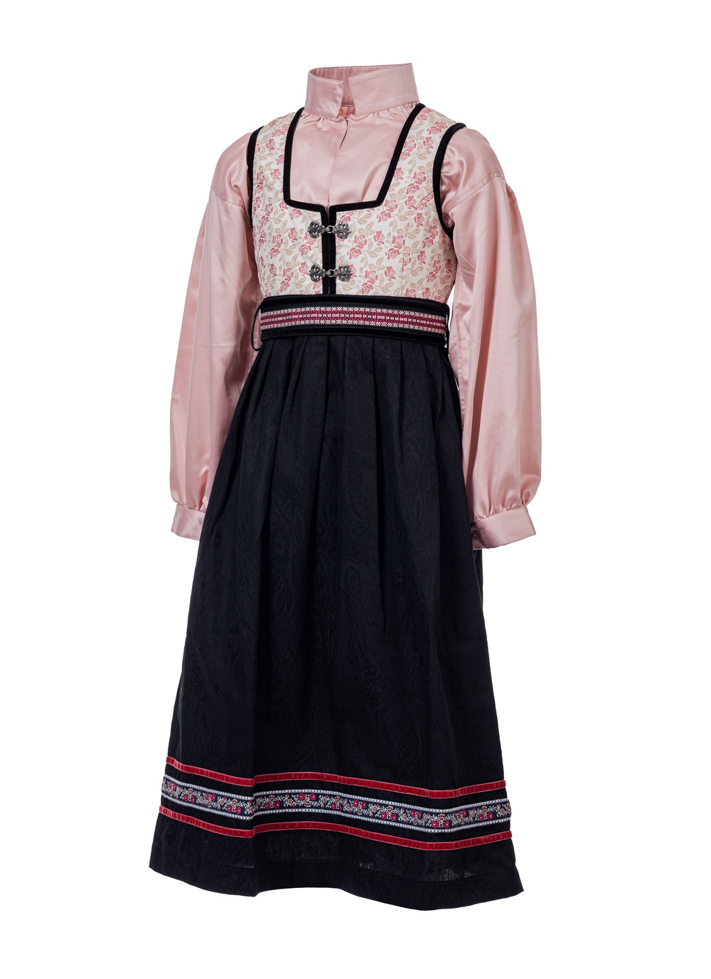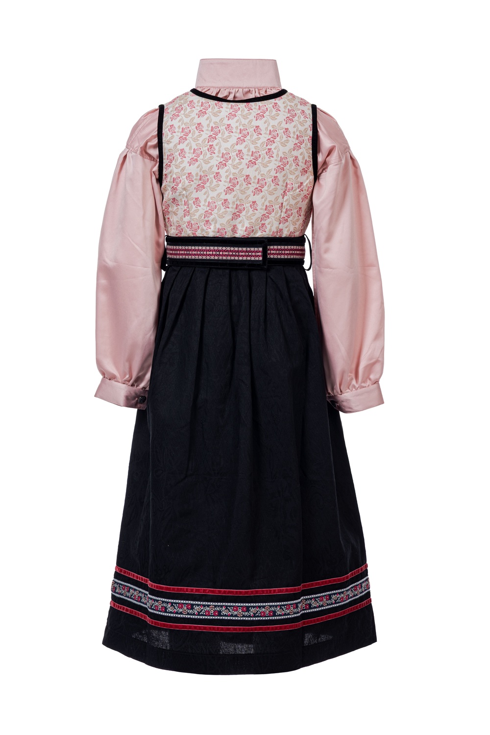 Nyhet! Festdrakt med rosa skjorte. Fine bånd og detaljer. Belte i liv som kan strammes. Det finnes veske og silkeskjerf som kan kjøpes i tillegg.