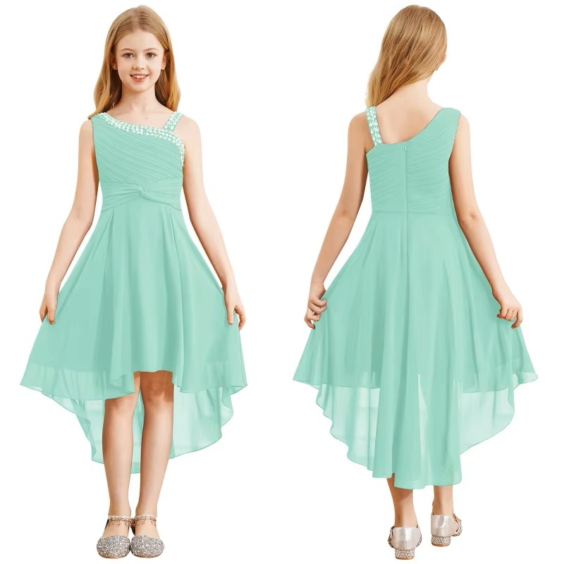 Nydelig kjole til jente. Medium lengde. One shoulder med stropp. Nydelig kant med palljetter. Bred midje med fint snitt og glidelås bak og lett skjørt.... Les mer