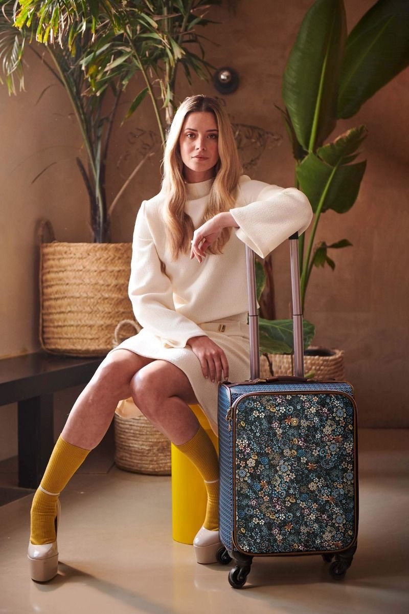 Denne kofferten på hjul i fargen blå med Tutti i Fiori-design er en flott vogn for reiser. kofferten har et stort oppbevaringsrom for klær og...Denne kofferten på hjul i fargen blå med Tutti i Fiori-design er en flott vogn for reiser. kofferten har et stort oppbevaringsrom for klær og sko, der du finner 3 sidelommer. En med glidelås og to med strikk. Det ytre og indre materialet er vannavstøtende, så det er perfekt for enhver værmelding. I bunnen av kofferten finner du 4 hjul, som hver kan rotere 360 grader. Størrelsen på kofferten gjør den egnet for håndbagasje på flyet.