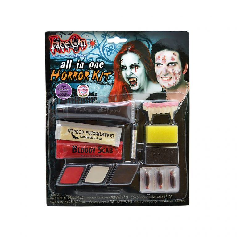 Alt-i-ett sminkesett for å lage et skummelt ansikt. Perfekt til Halloween og utkledning.