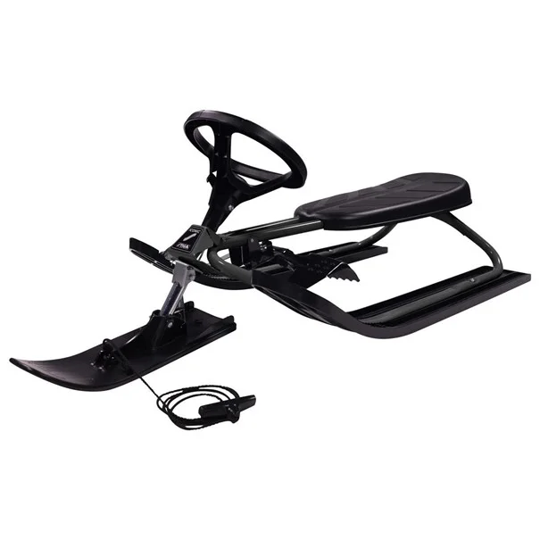 Denne mindre kjelken er konstruert med en solid stålramme og en brems for å sikre trygg kjøring. De rette skiene og det lettstyrte rattet gir utmerket kontroll.