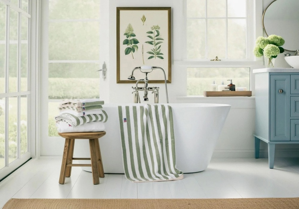 Det klassiske blokkstripete håndkleet i vintage grønn, hvit og moonbeam gir en frisk, tidløs estetikk til badet ditt. Laget av 100% høykvalitets 600g ringspunnet bomullsfrotté, er dette håndkleet både mykt og svært absorberende. Det sofistikerte blokkstripede designet har en brettet kontrastkant med jacquard-tekstlogo på topp og bunn, mens en vevd Lexington-logo nederst foran gir et autentisk preg. Oeko-tex-sertifisert for din trygghet.