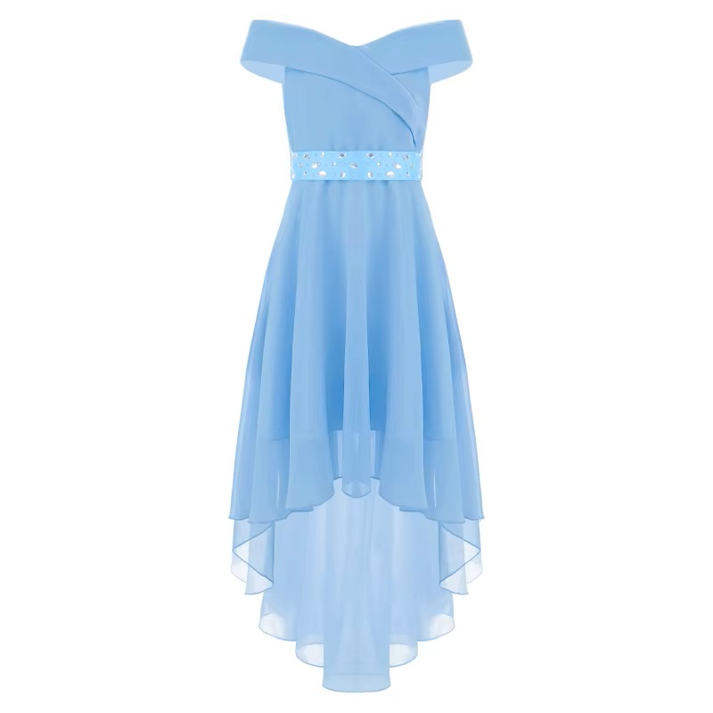 Festkjole til jente og ungdom uten armer og off-sholder. Beltet i livet er fylt med stener og knytes bak. Skjørtet har medium lengde foran og...Festkjole til jente og ungdom uten armer og off-sholder. Beltet i livet er fylt med stener og knytes bak. Skjørtet har medium lengde foran og er langt bak. Veldig fin til party, skoleball, bryllup osv. Eks 12 år - 152 cm høydeLes mer