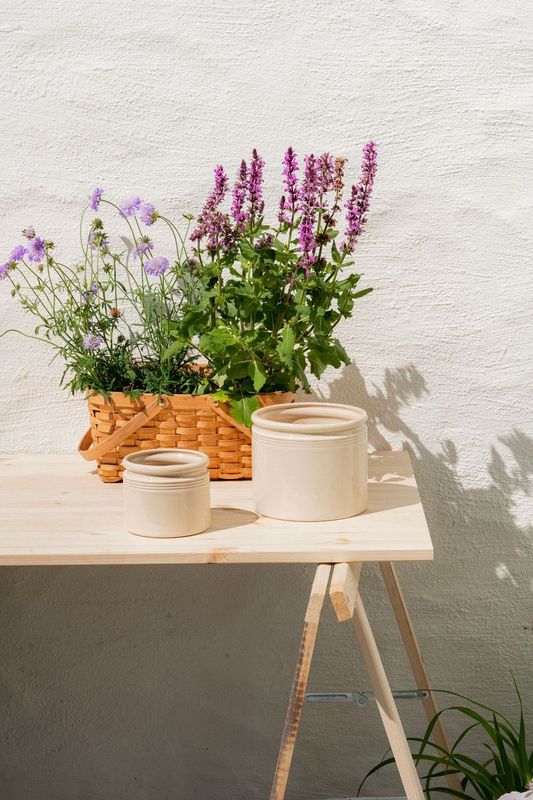 Krukkene og skålene er laget i leirtypen leirgods og fargeglasuren er testet og er giftfri. Så krukker og skålene kan brukes til både til mat, redskaper og planter.