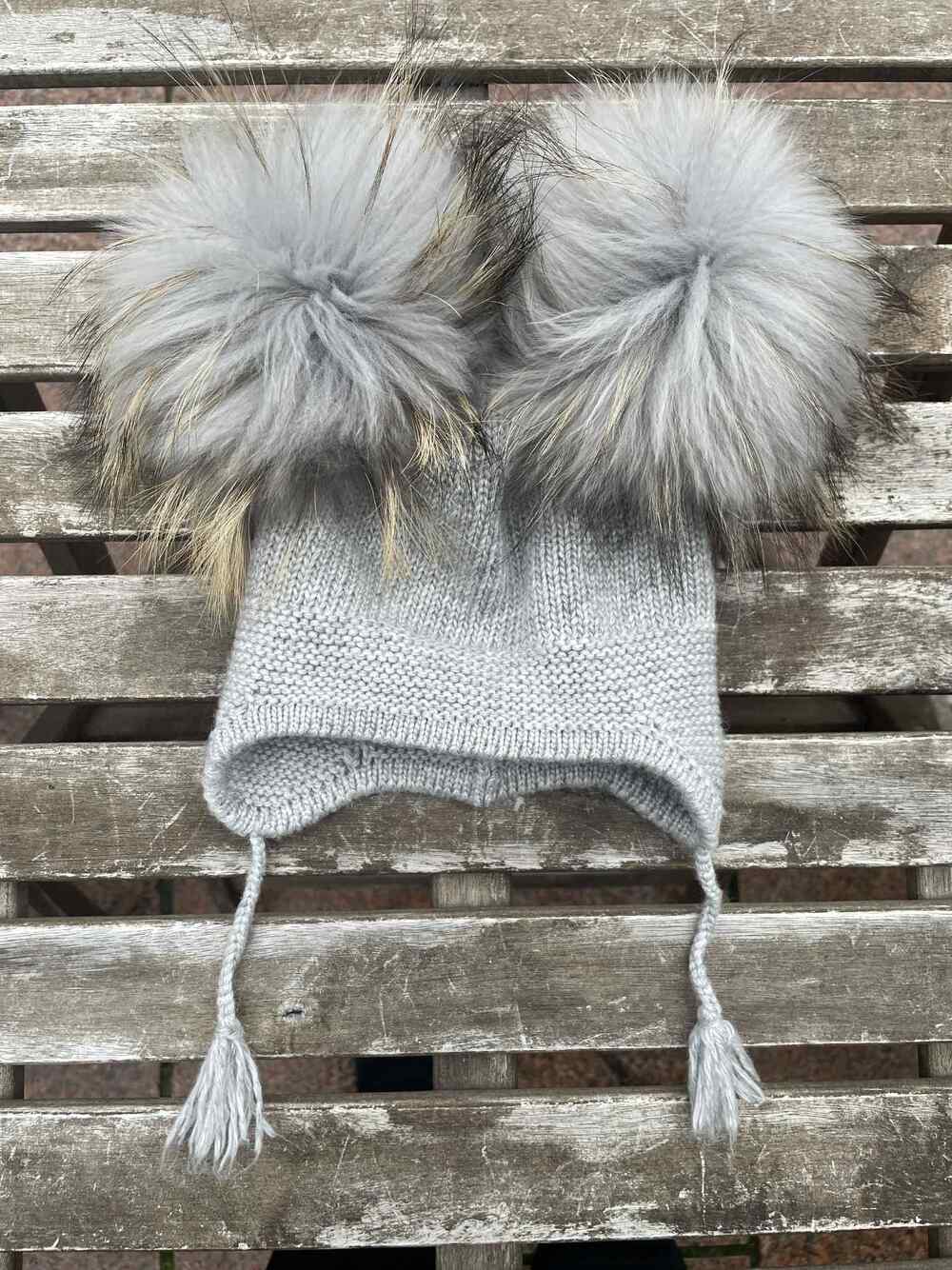 Søt og varm lue i ull med 2 avtagbare pels dusk. Strikket og fleksibel i størrelse. God passform. Finnes i 2 størrelser. Vaskes på ullprogram.... Les mer